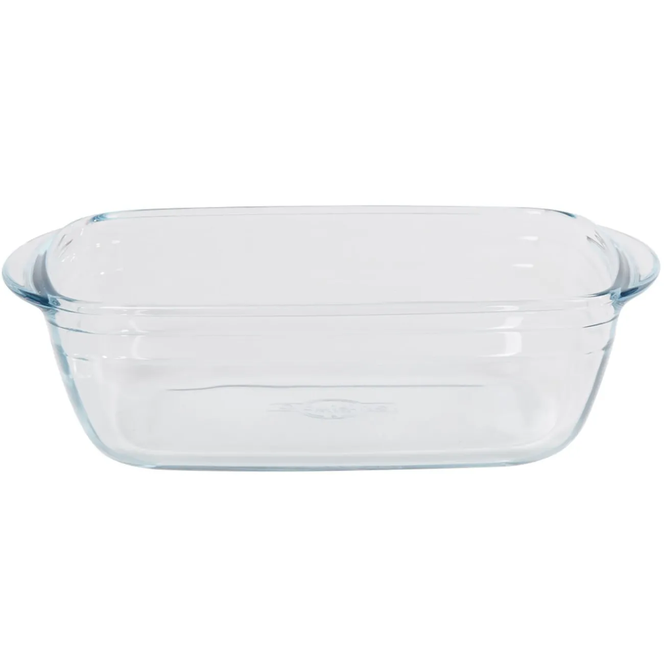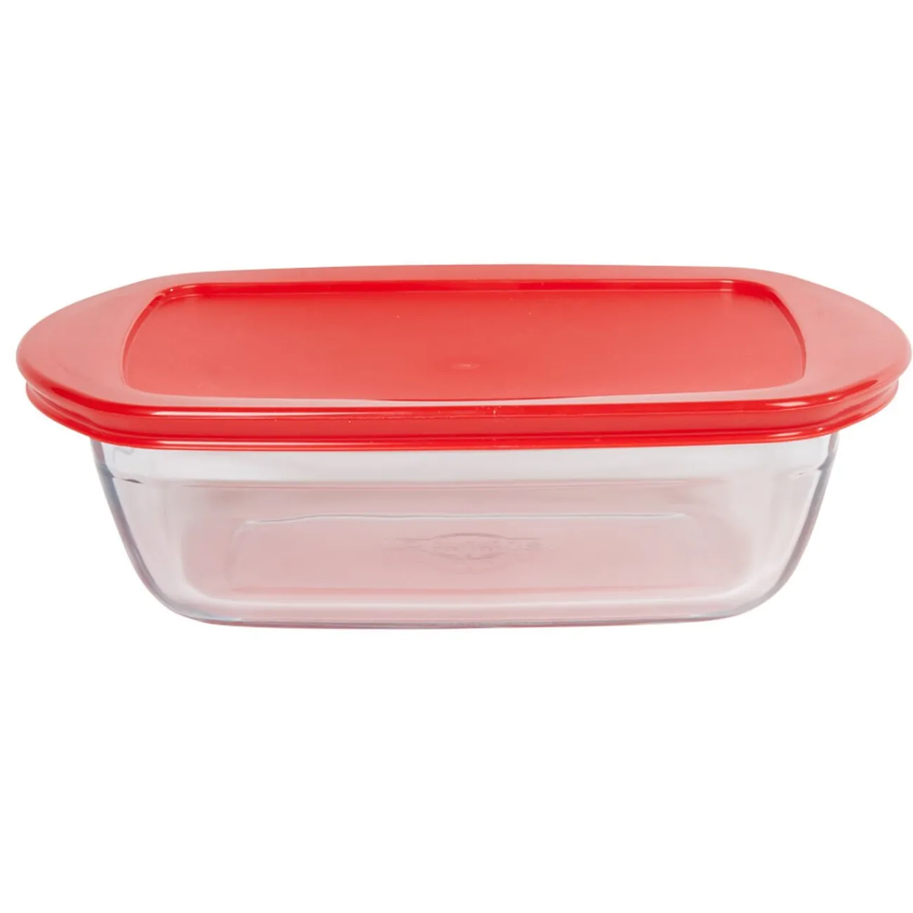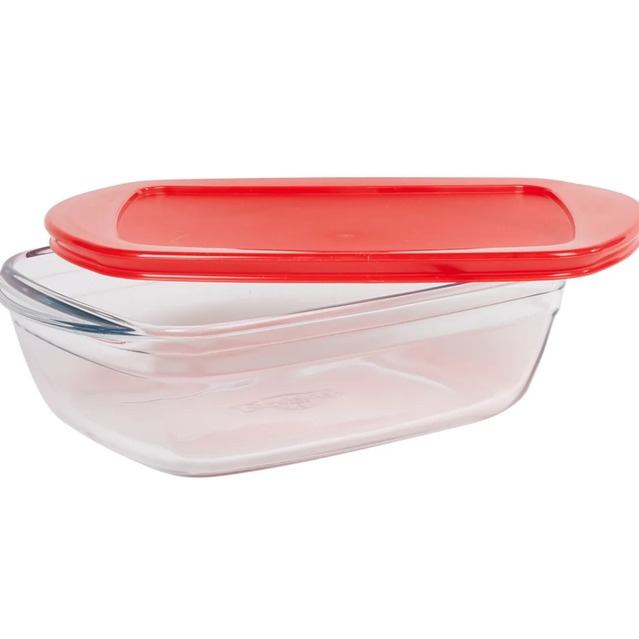 Plat à four rectangulaire en verre transparent avec couvercle plastique.