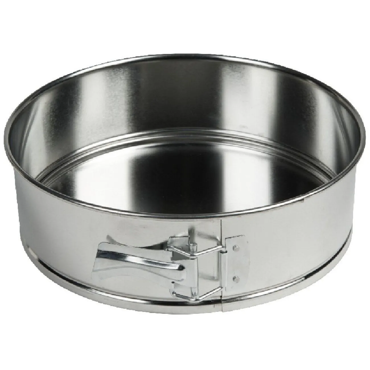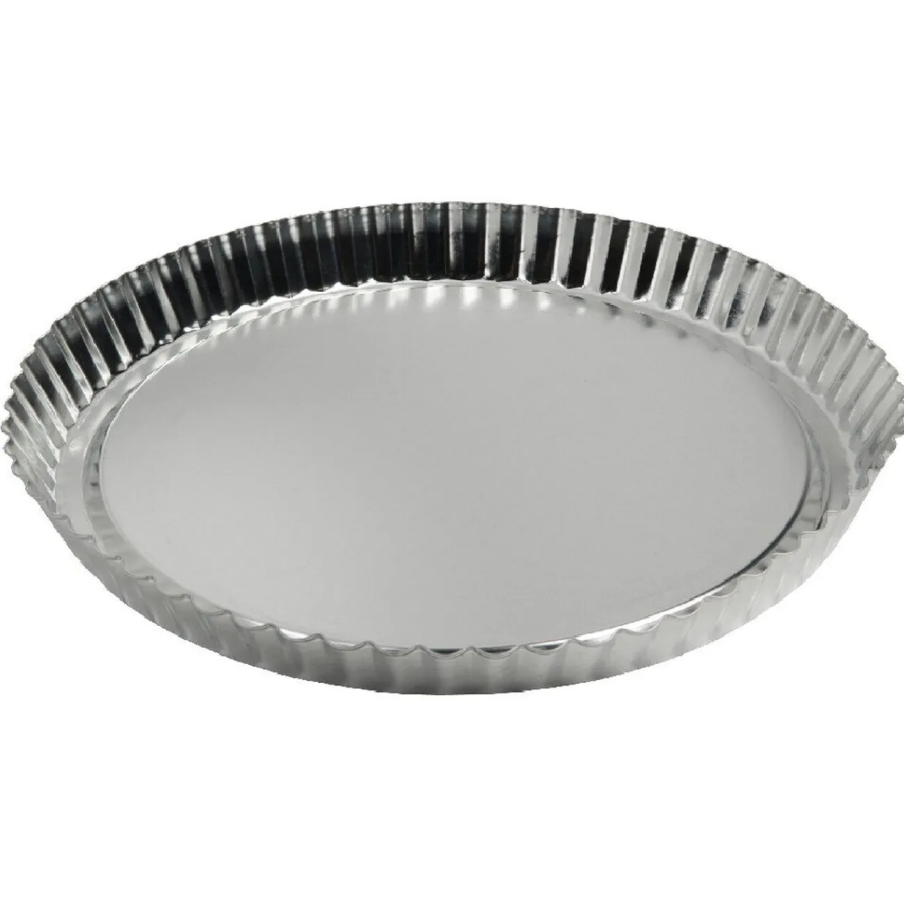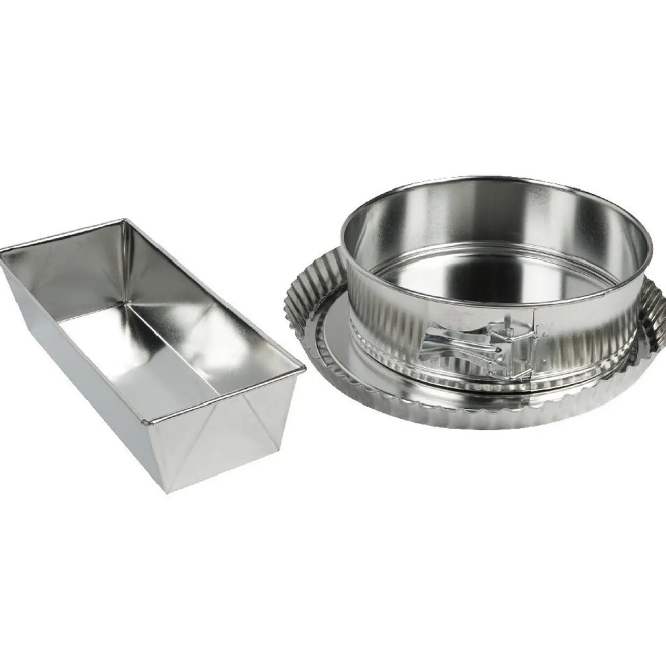 Lot de 3 plats à pâtisserie en métal : moule à manqué Ø 24 cm, moule à tarte Ø 31 cm et moule à cake 28×11 cm.
