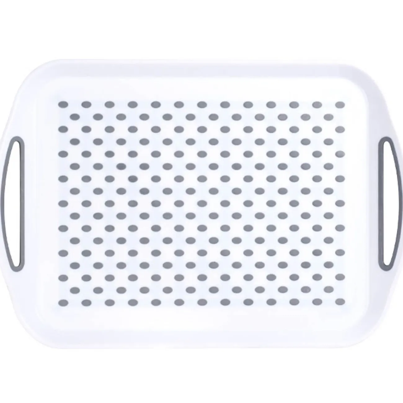 Ne prenez plus aucun risque en transportant vos boissons ou collations avec ce plateau antidérapant blanc et gris doté de poignées.
