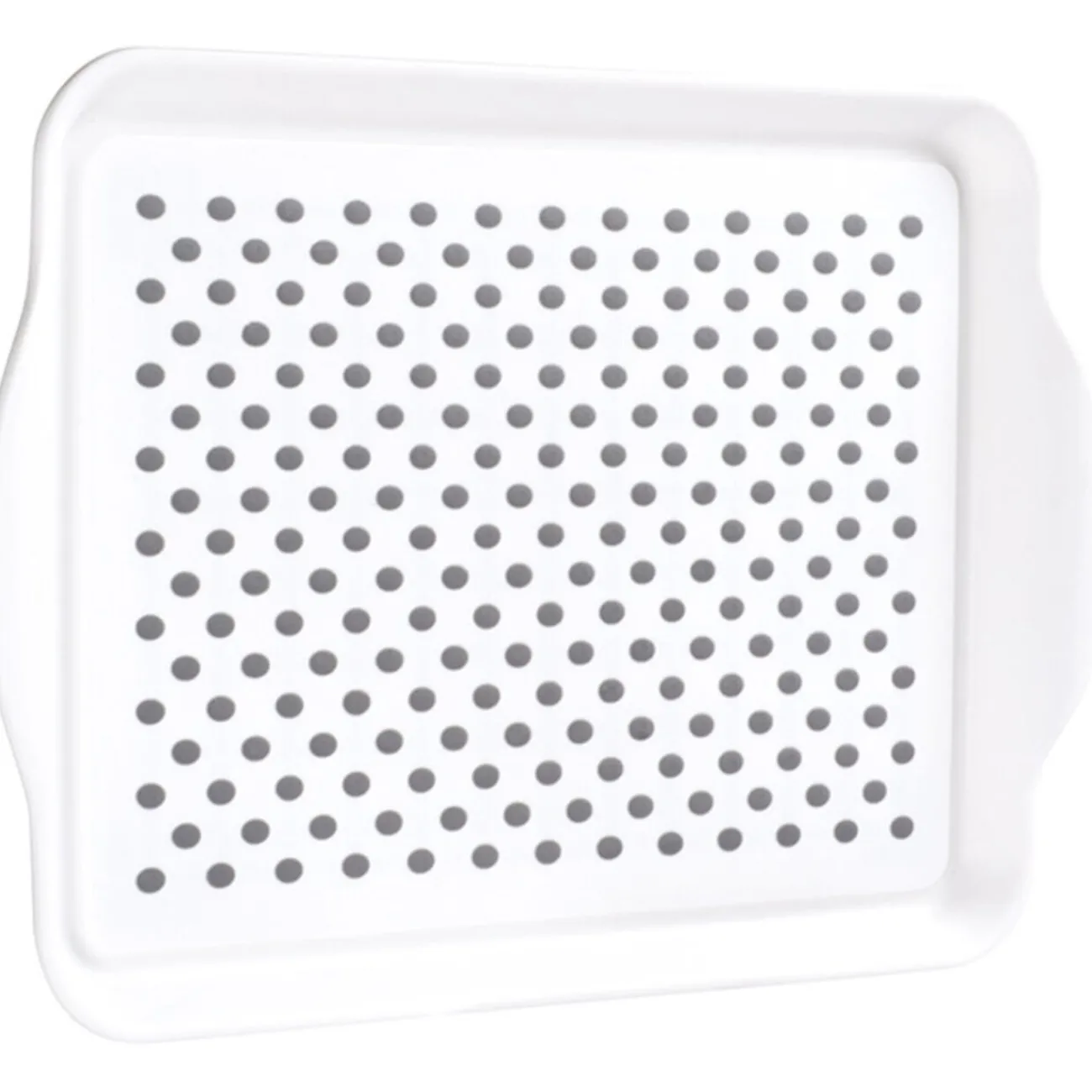 Plateau antidérapant en polypropylène, blanc avec des picots gris. Dimensions : 40,2x27x3 cm.