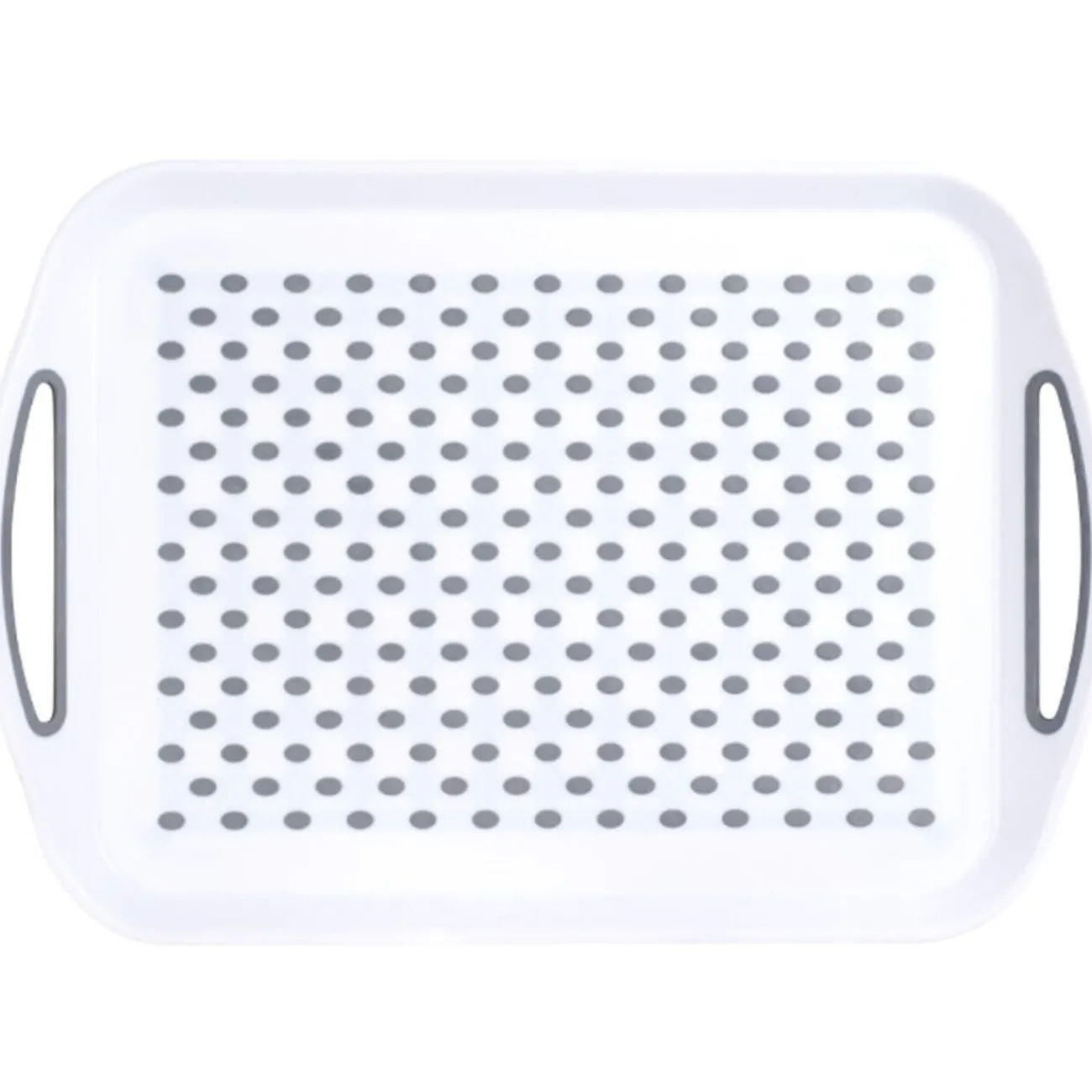 Plateau antidérapant en polypropylène, blanc avec des picots gris. Dimensions : 45,5x32x4,5 cm.