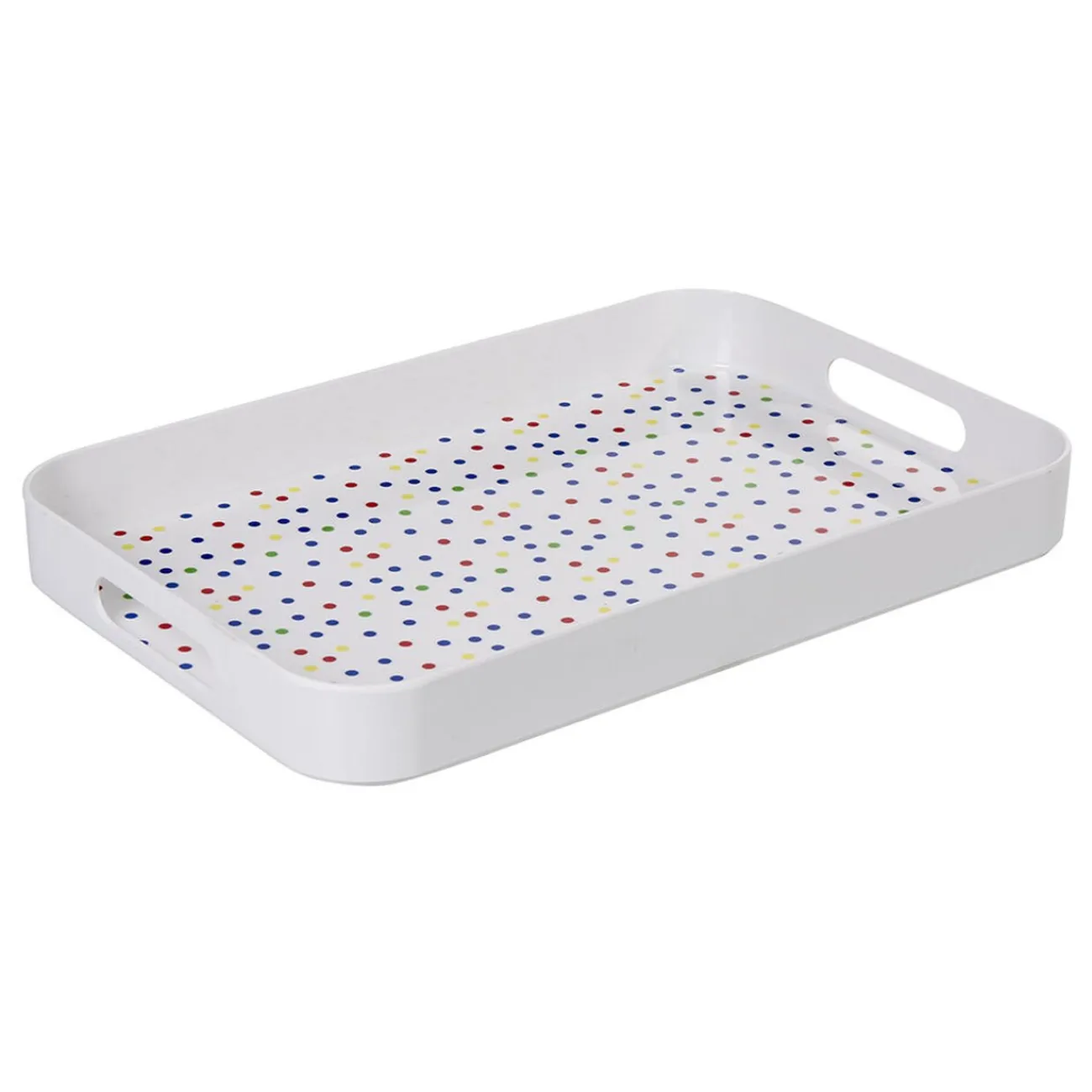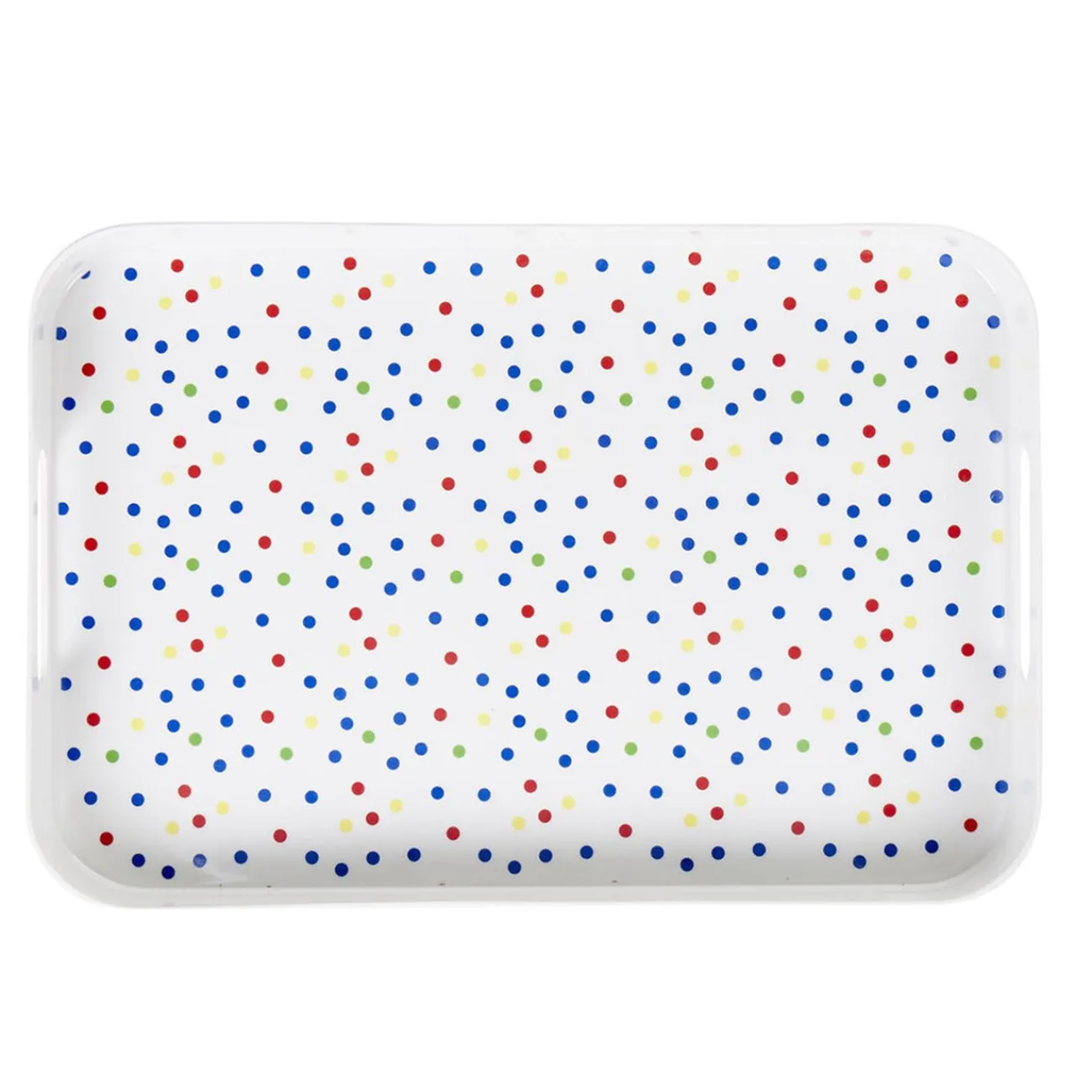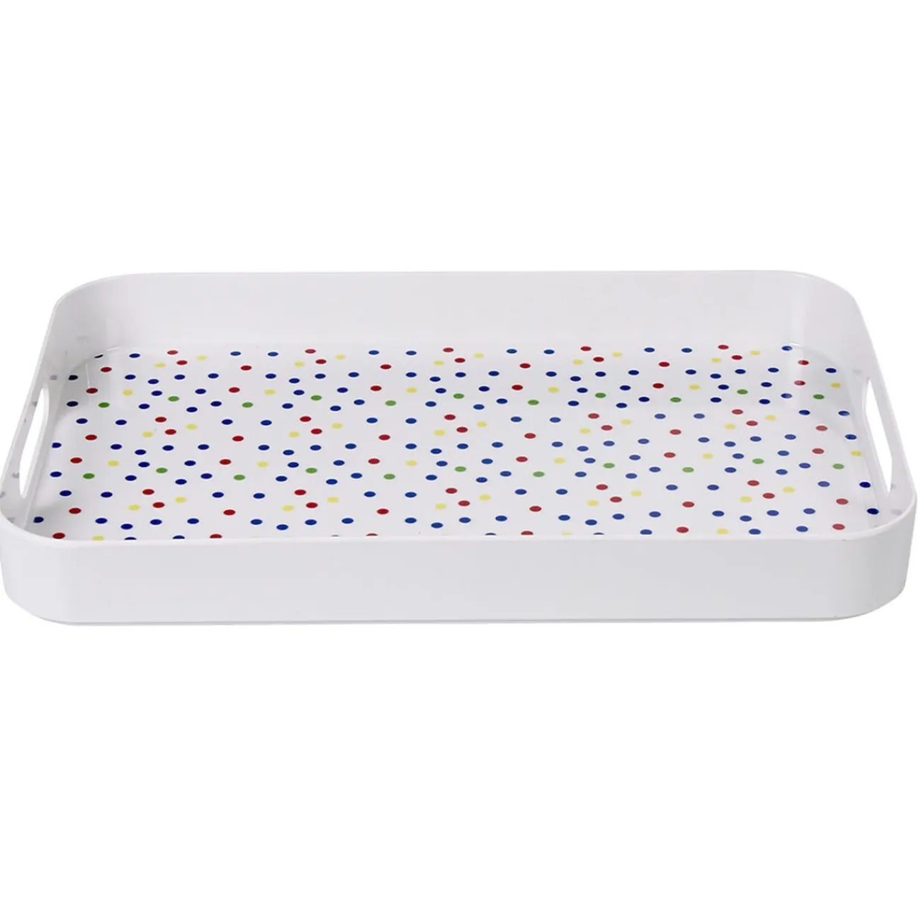 Plateau en plastique mélaminé blanc et intérieur à motif pois multicolores.