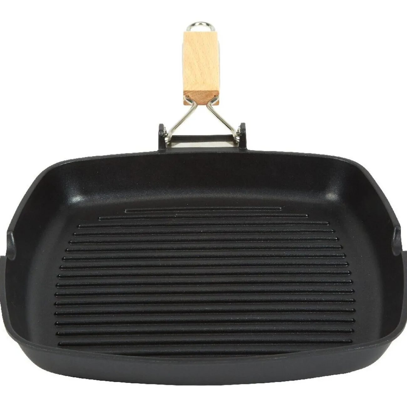 Poêle grill en aluminium forgé avec manche en bois amovible, de forme carré, vous permet de cuire diverses grillades tout en évitant le gras de cuisson. Pratique, elle est compatible sur tous types de feux y-compris ceux à induction.