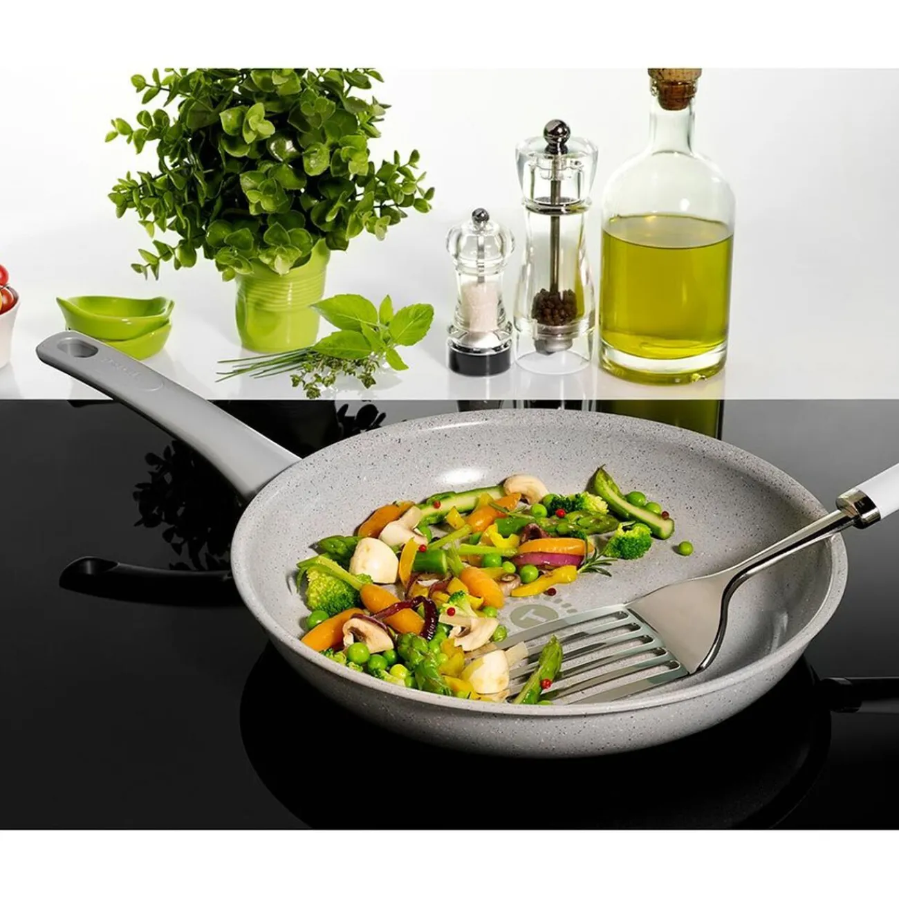 Poêle Tefal Preserve de 24 cm de diamètre avec revêtement intérieur et extérieur en céramique de couleur grise. Avec Tefal Preserve, révèlez les saveurs et vitamines de vos plats du quotidien.
