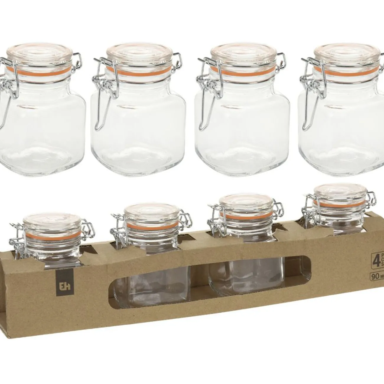Lot de 4 pots de conservation en verre avec joint en silicone d’une capacité de 90 ml chacun.