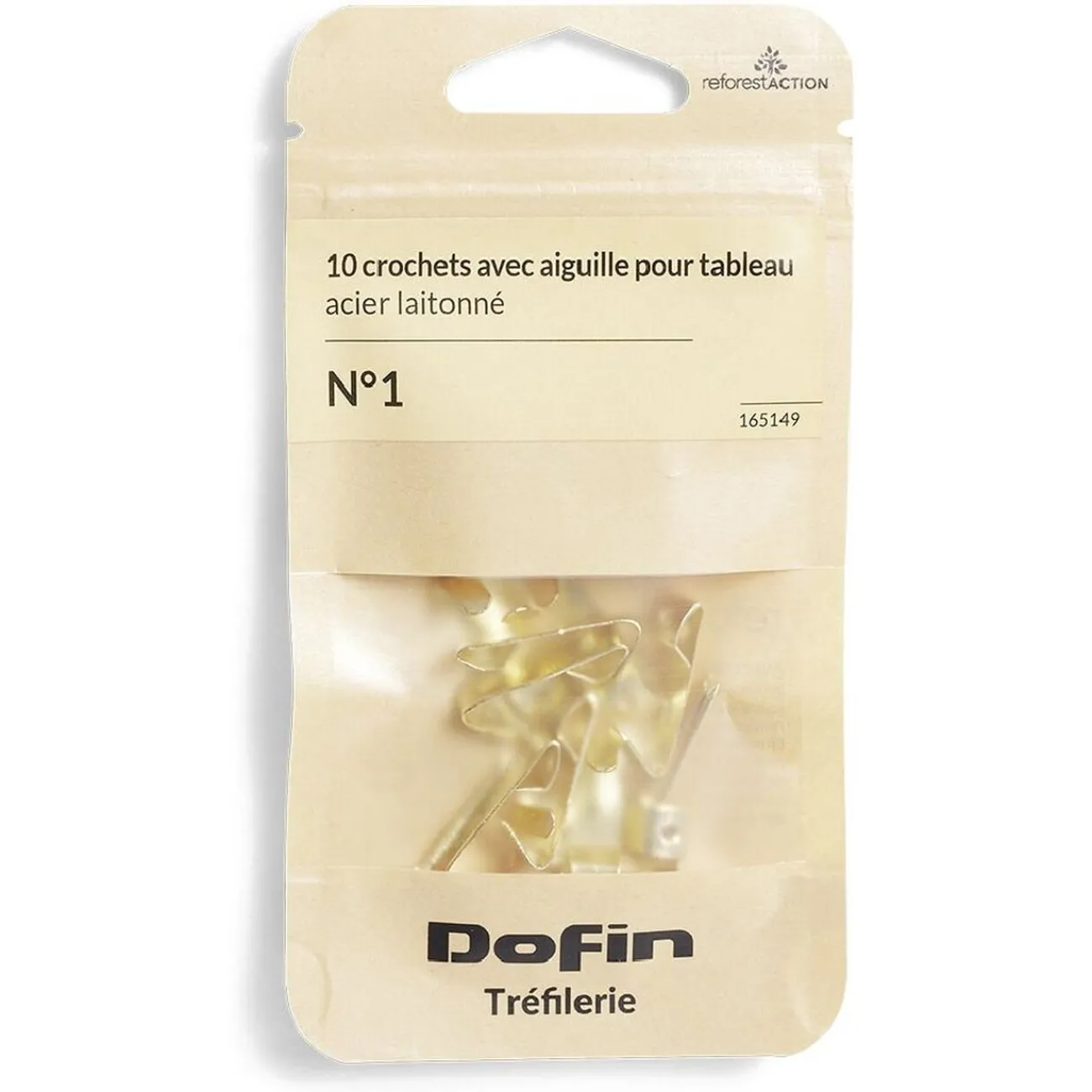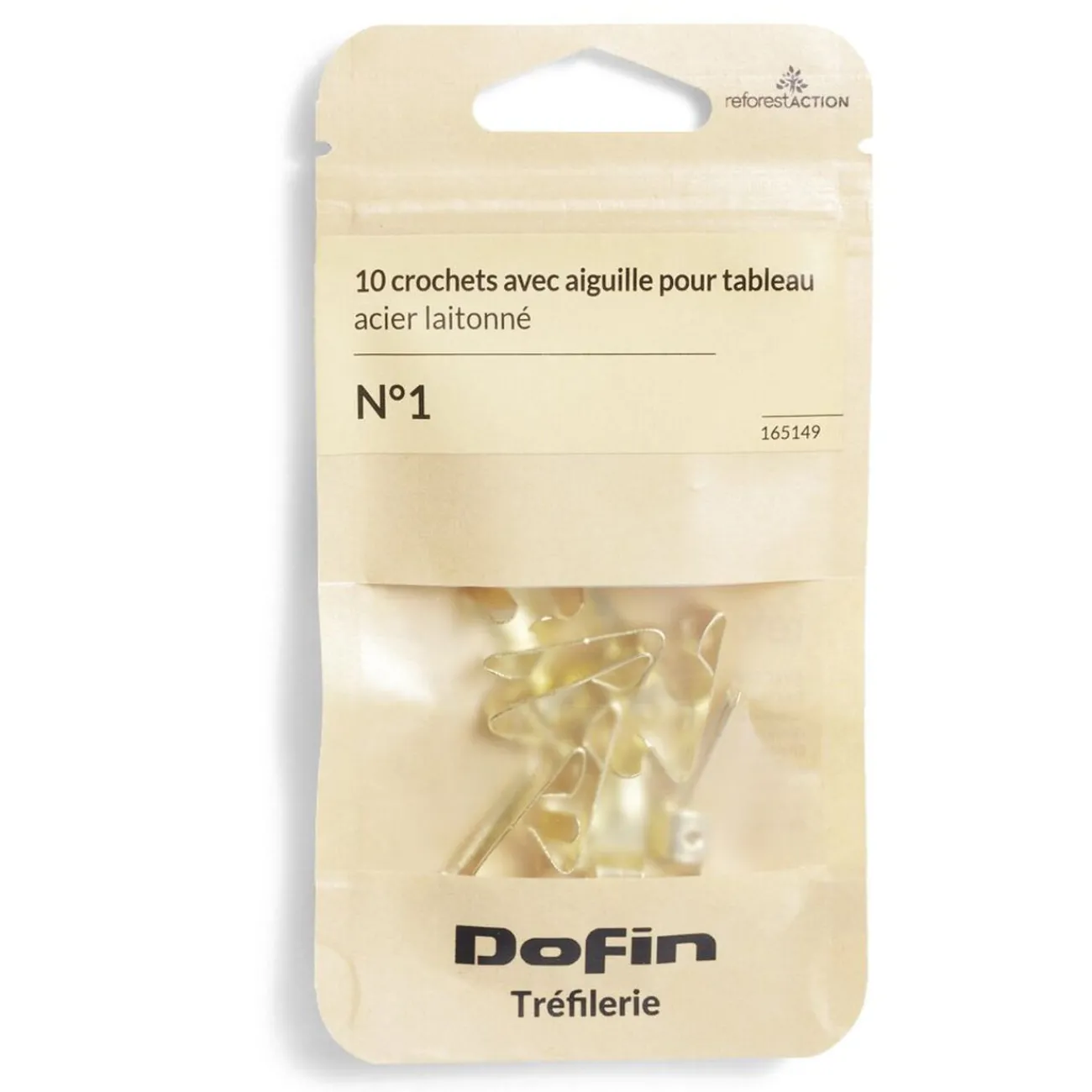 Lot de 10 crochets en acier laitonné avec aiguilles N°1 pour fixer des tableaux et cadres légers au mur.