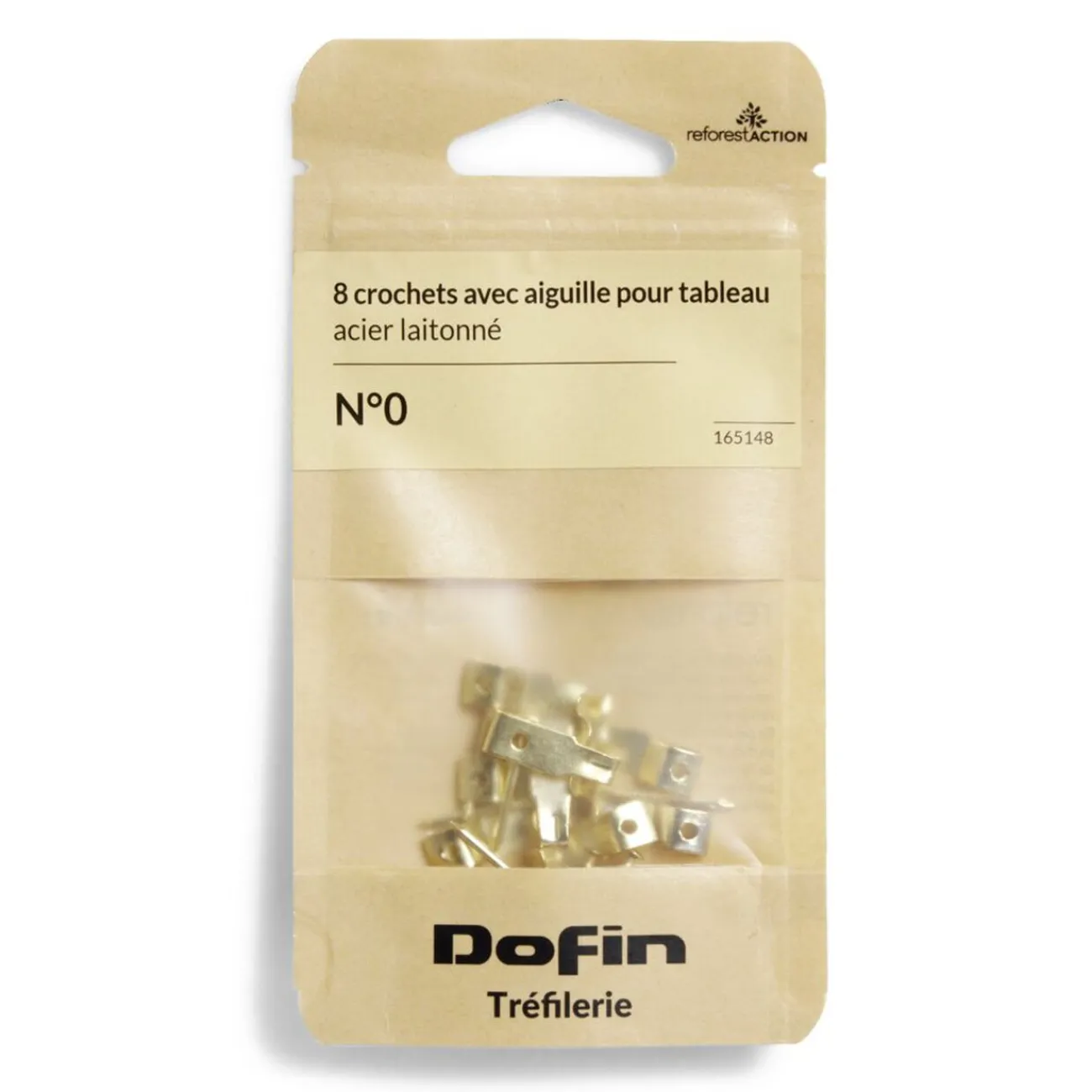 Lot de 8 crochets en acier laitonné avec aiguilles N°0 pour fixer des tableaux et cadres légers au mur.