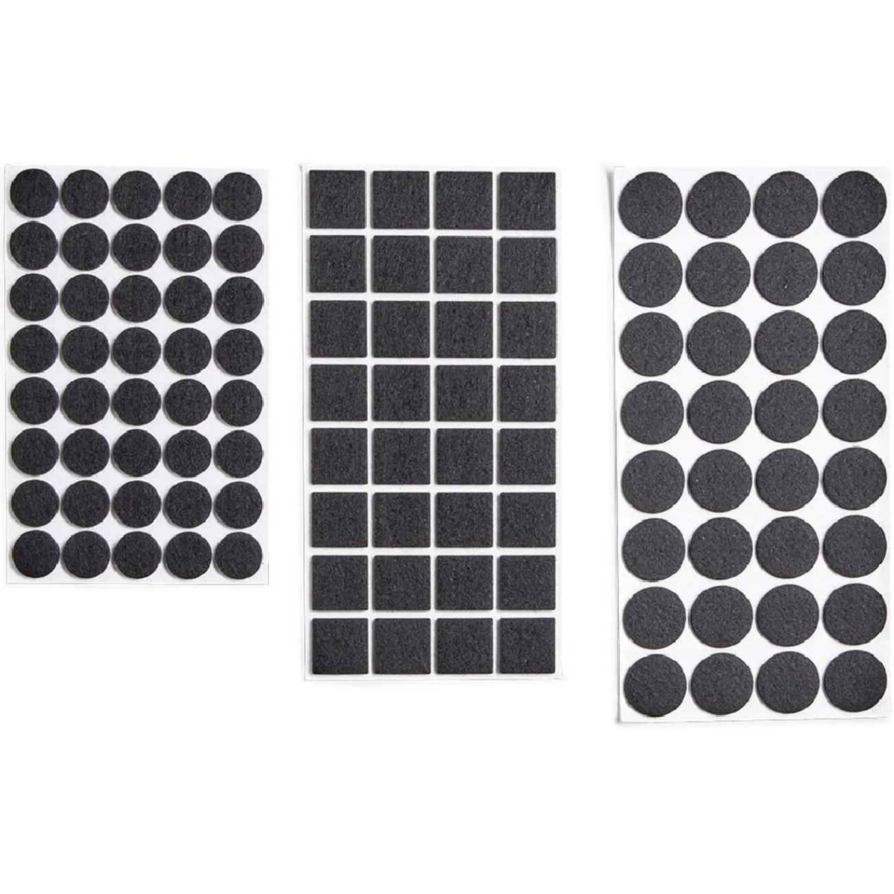 Assortiment de 104 patins en feutre noir. Idéal pour protéger les sols et amortir les bruits et les chocs en déplaçant les meubles.