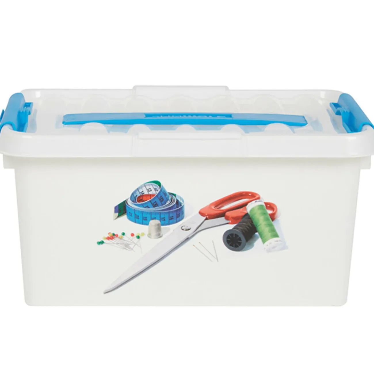 Boîte de rangement spécial couture 6 L, dim. 30x20x14 cm, plastique. Nombreux compartiments, poignée et fermeture par clip.