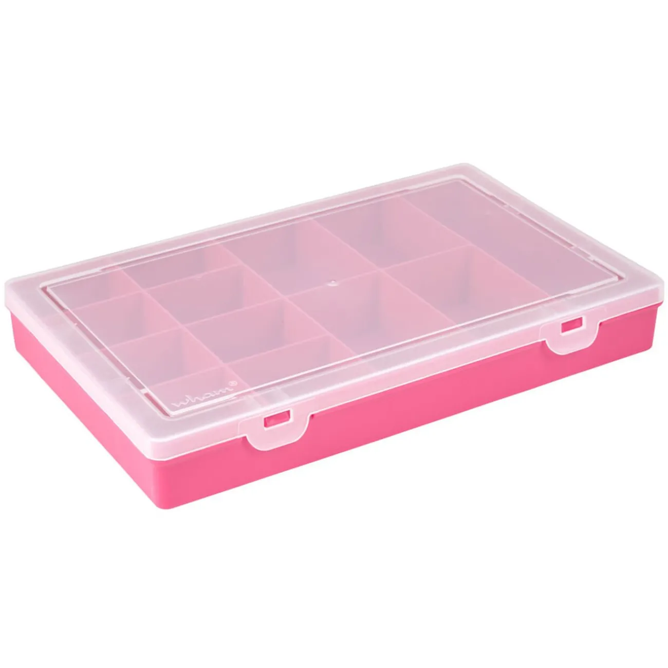 Boîte de rangement 13 compartiments rose fuchsia avec couvercle transparent, dim. 29x19xh.4 cm, plastique.