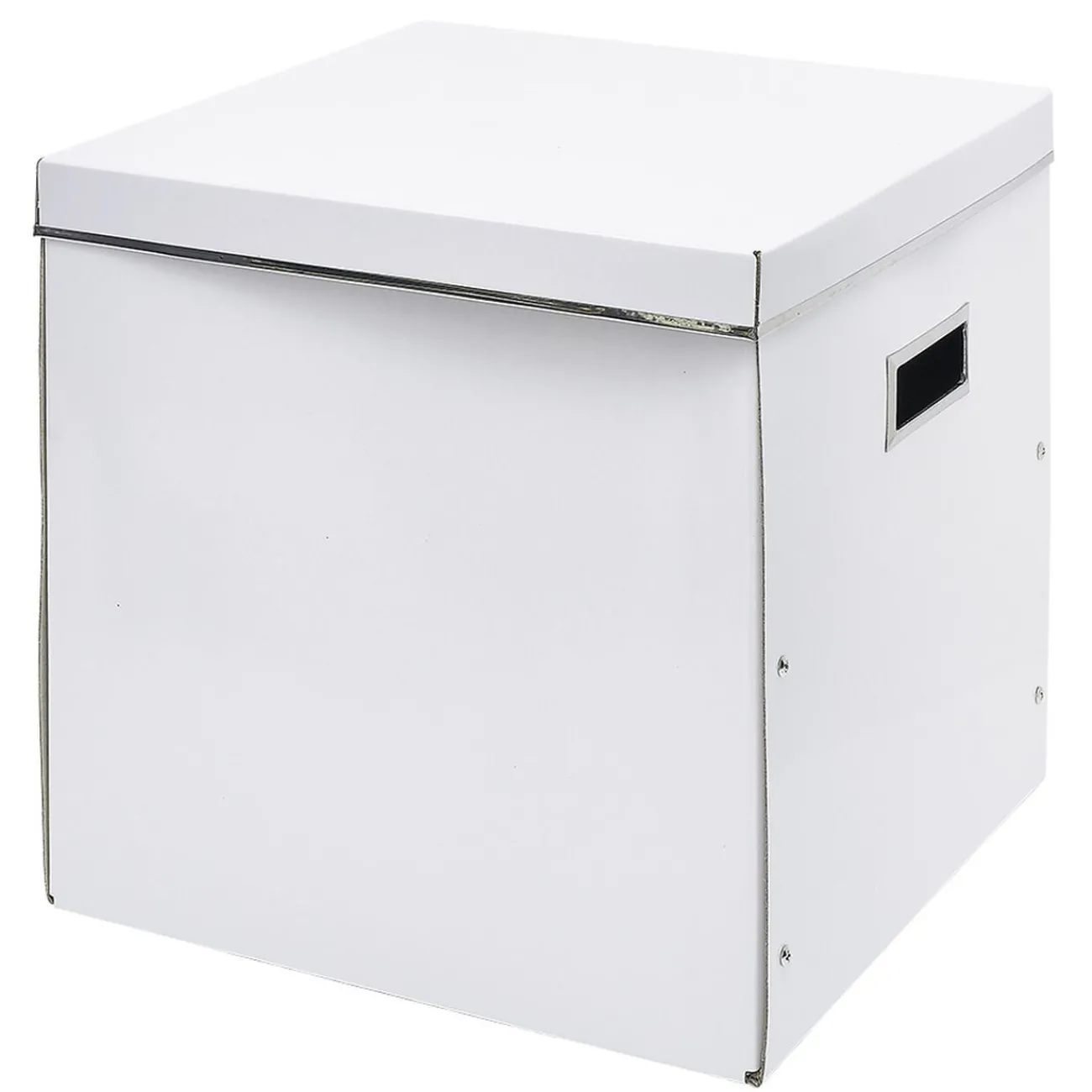 Boîte de rangement avec couvercle en carton uni avec renfort en métal et emplacement pour indiquer le contenu.