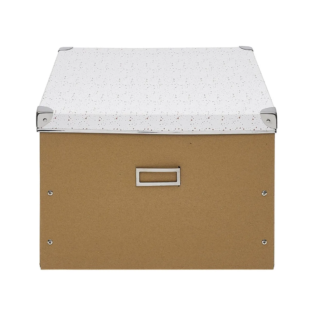 Boîte de rangement en carton avec une partie unie marron et l’autre partie blanche motif terrazzo effet granit.