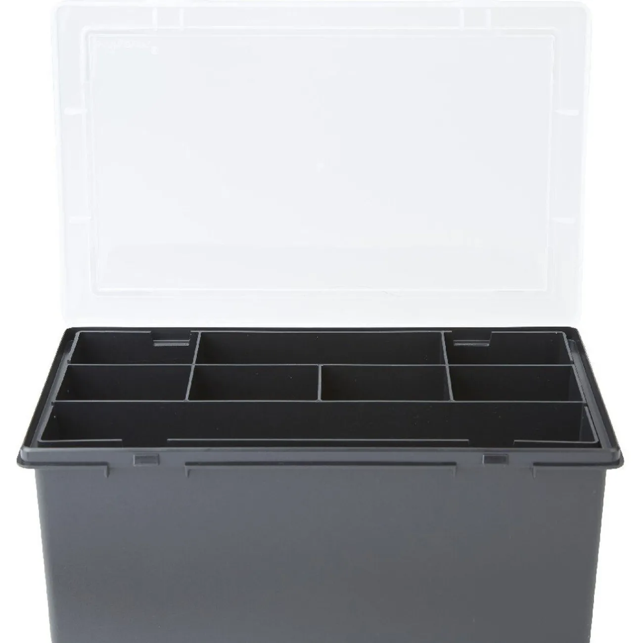 Boîte de rangement organisateur avec 8 compartiments en plastique noir. Résistante et légère, cette boîte comprend un plateau amovible de 7 compartiments, idéal pour ranger des petits articles de bricolage et de loisirs créatifs.