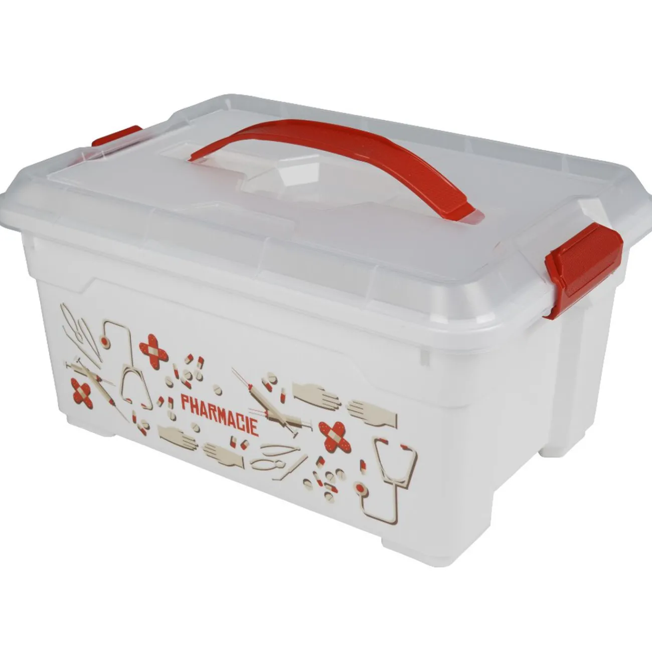 Boîte de rangement pharmacie avec plateau intérieur amovible à 4 compartiments.