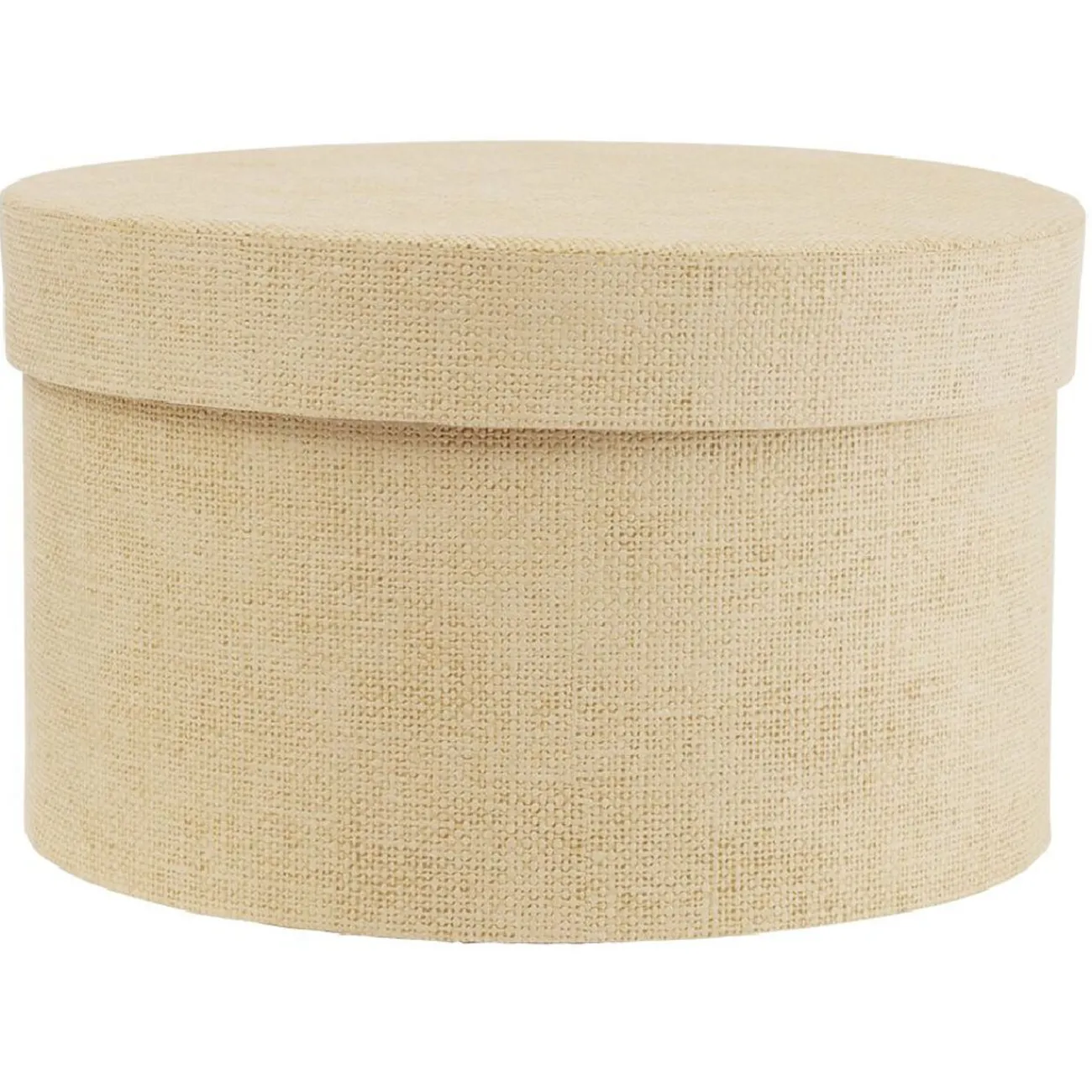 Petite boîte ronde avec couvercle effet tissu beige, très pratique pour ranger les petits accessoires dans le bureau, la chambre ou le salon.