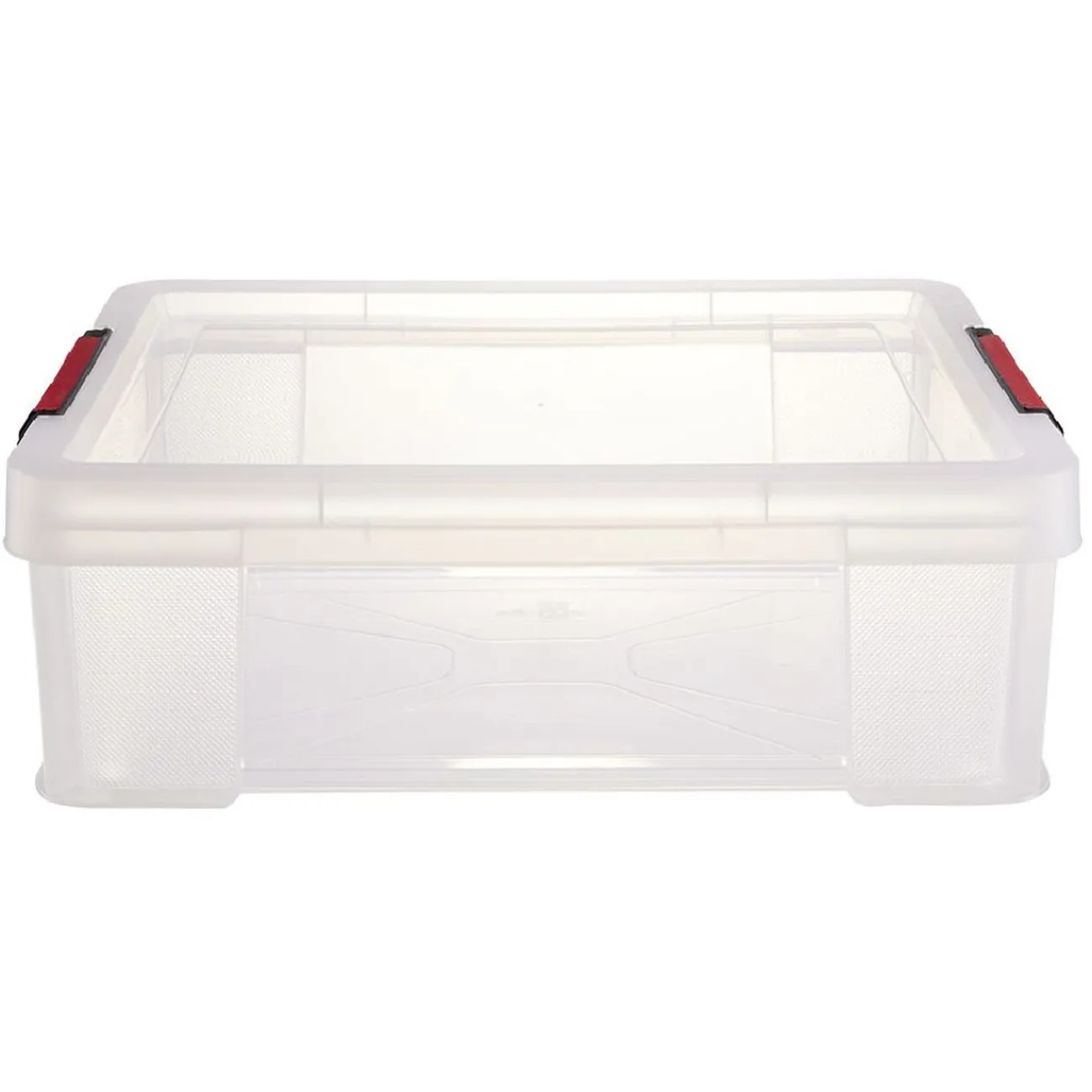 Boîte de rangement en plastique transparent avec couvercle à fermeture par clips rouges. Idéal pour garder vos fournitures de bureau à l’abri de la poussière et parfaitement rangés.
