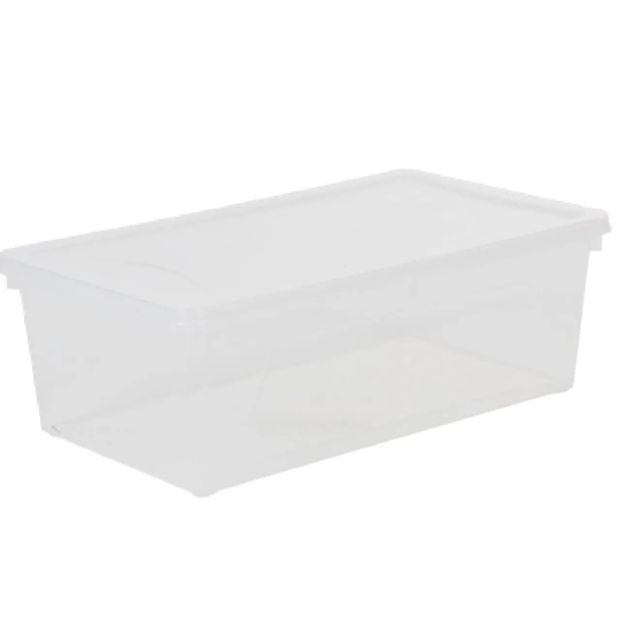 Boîte de rangement en plastique transparent avec couvercle pour ranger textile ou petits objets.