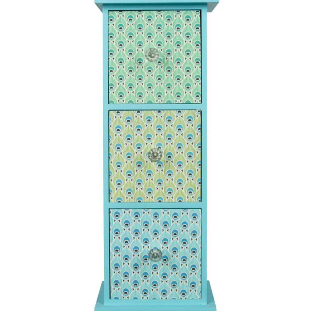 Boîte déco bleu motifs paon 3 tiroirs, MDF (panneau de fibres de bois). Dim. 13×9,8×35 cm.