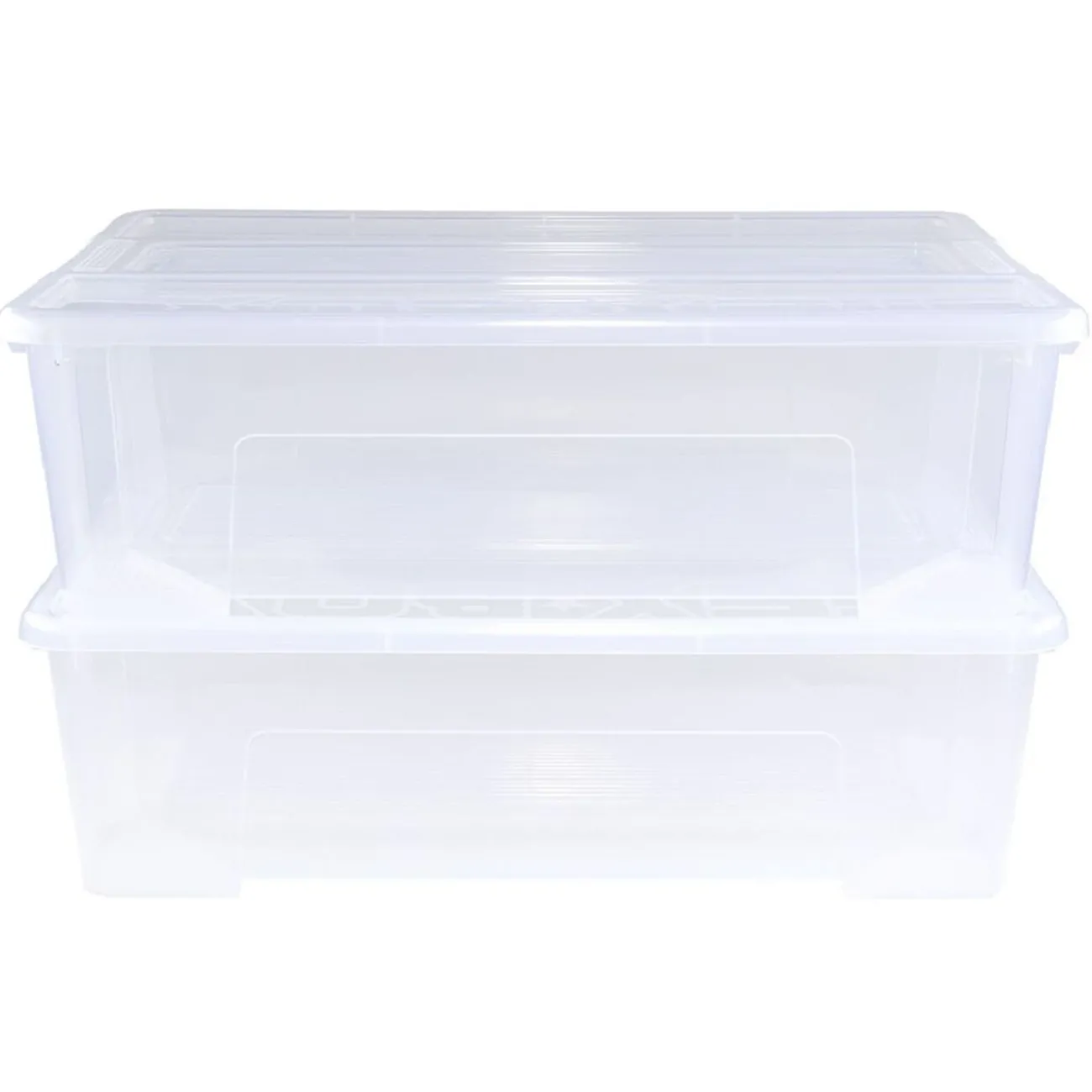 Lot de 2 boîtes en plastique transparent d’une contenance de 28 litres, idéales pour vos rangements de dessous de lit afin d’éviter à vos vêtements, couettes et autres affaires de prendre la poussière.