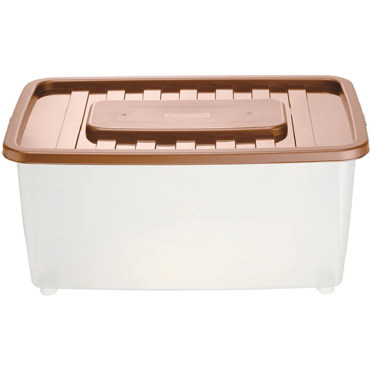 Box de rangement en plastique transparent avec couvercle de couleur.