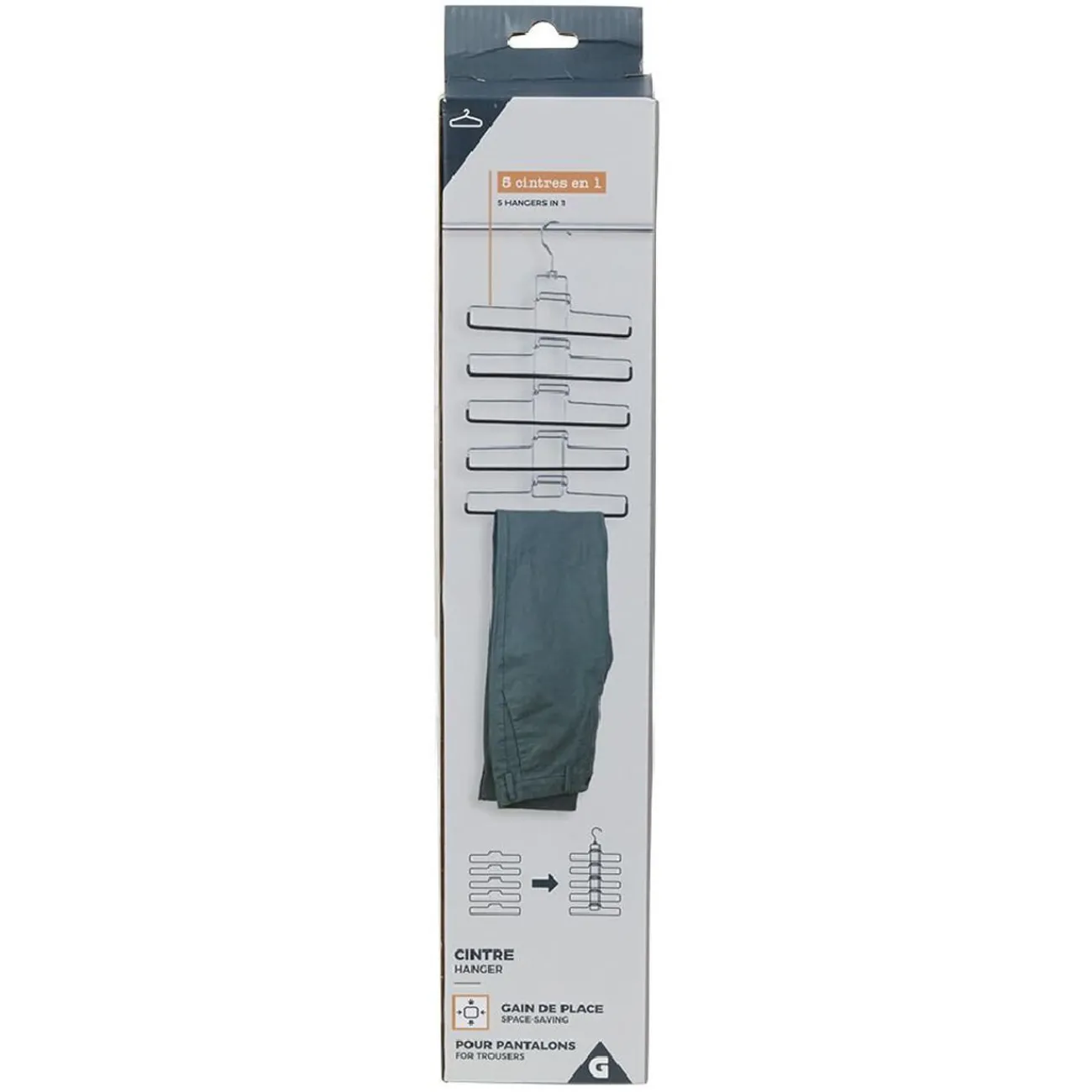 Ne cherchez plus vos pantalons au fond de votre dressing, grâce à ce cintre gain de place vous pourrez y accéder rapidement et simplement. Vous pourrez y suspendre jusqu’à 5 pantalons simultanément.