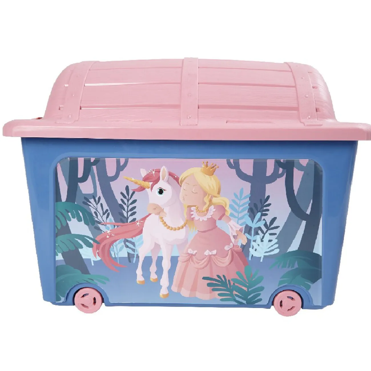 Coffre à jouets en plastique rose et violet design princesse licorne. Original et décoratif avec couvercle amovible en forme de malle au trésor et roulettes pour pouvoir le déplacer facilement.