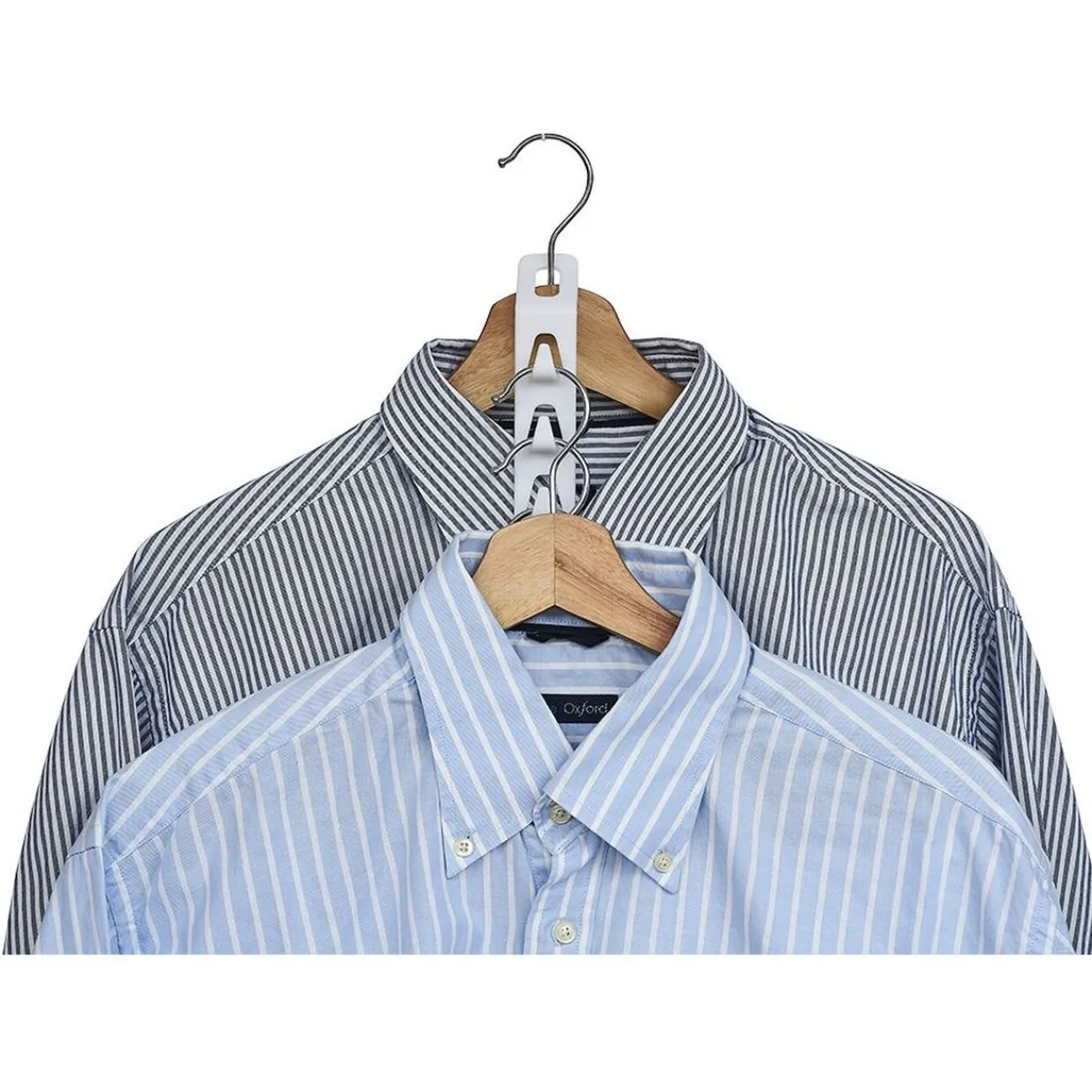 Optez pour ce crochet gain de place pour votre penderie. Pratique et ingénieux, en accrochant un crochet sur un cintre vous pourrez y suspendre 3 autres cintres et gagnerez en espace de rangement.
