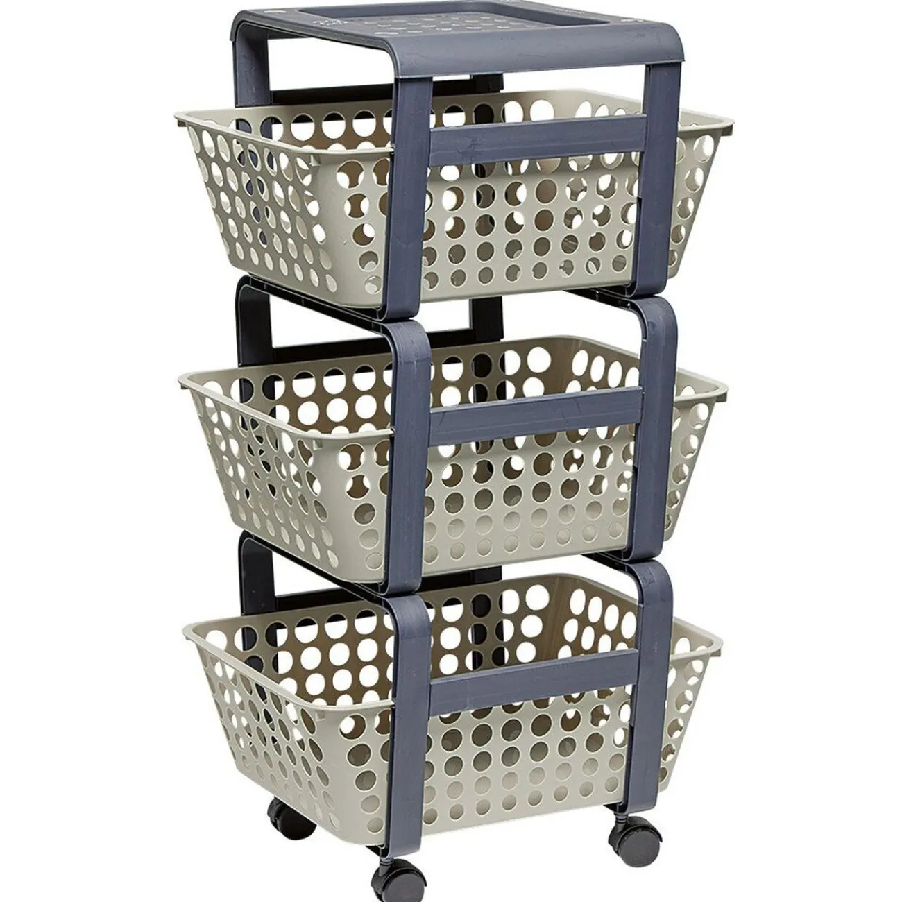 Desserte de rangement sur 3 niveaux avec panières grises amovibles.