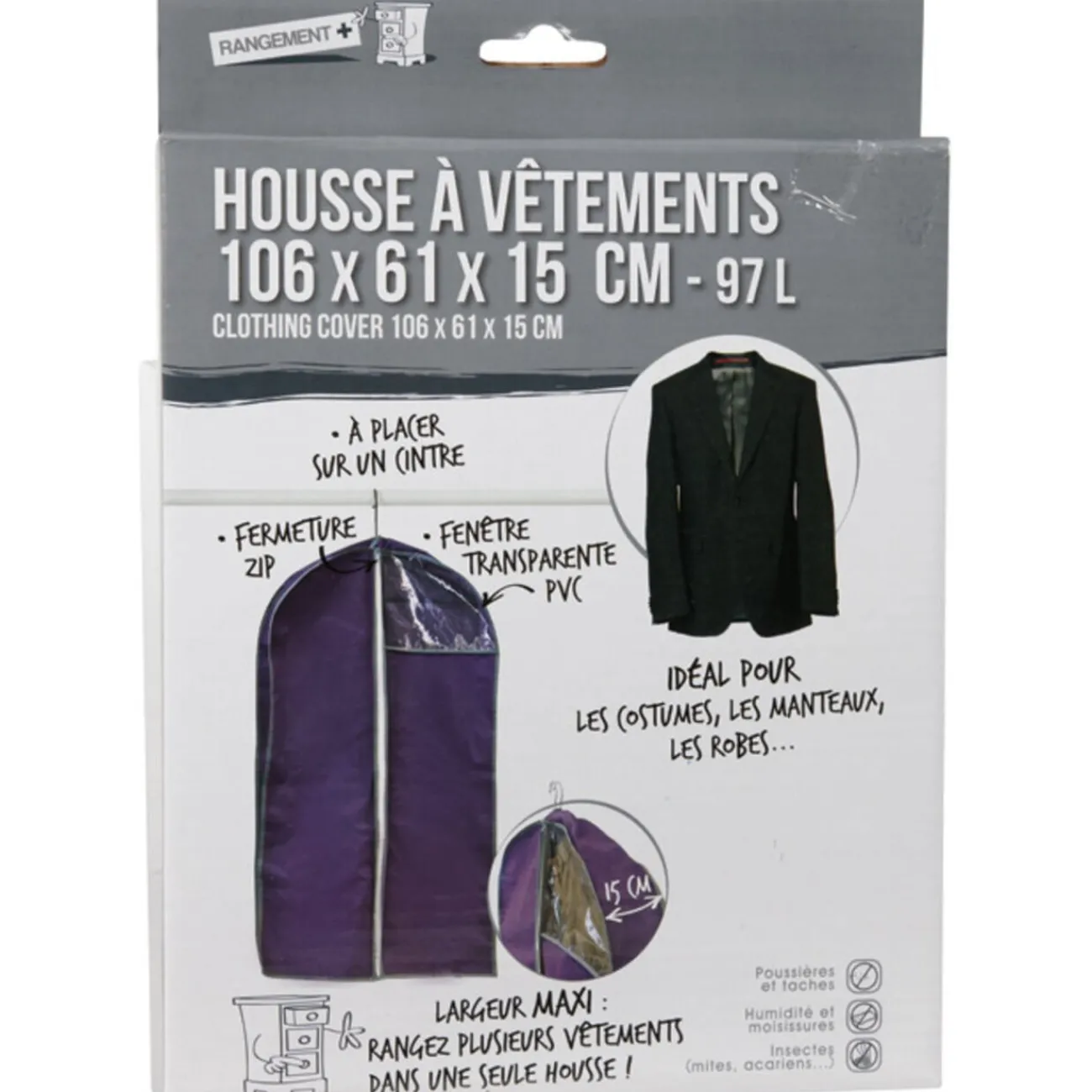 Housse à vêtements 97 L, dim. 106x61x15 cm, plastique. Fermeture à glissière, à placer sur un cintre, fenêtre transparente PVC, idéal pour les costumes, les manteaux, les robes… Protège de la poussière, des tâches, de l’humidité, des insectes…