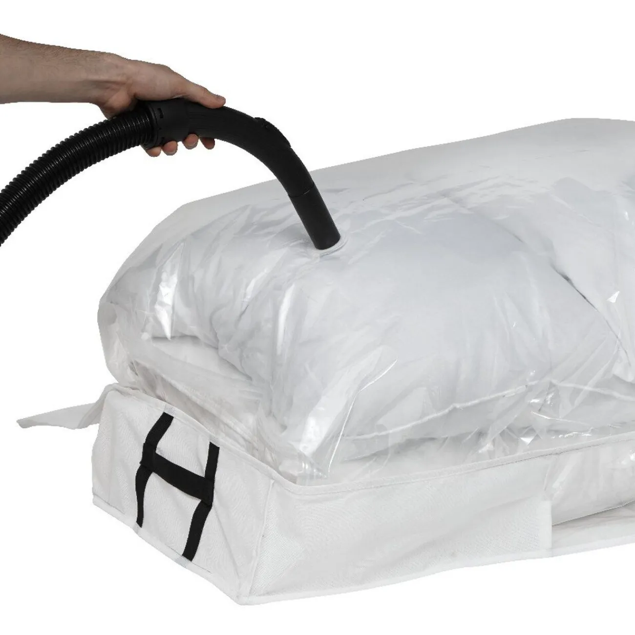 Housse de rangement dessous de lit avec sac vide air intégré pour un maximum de rangement dans un minimum de place.