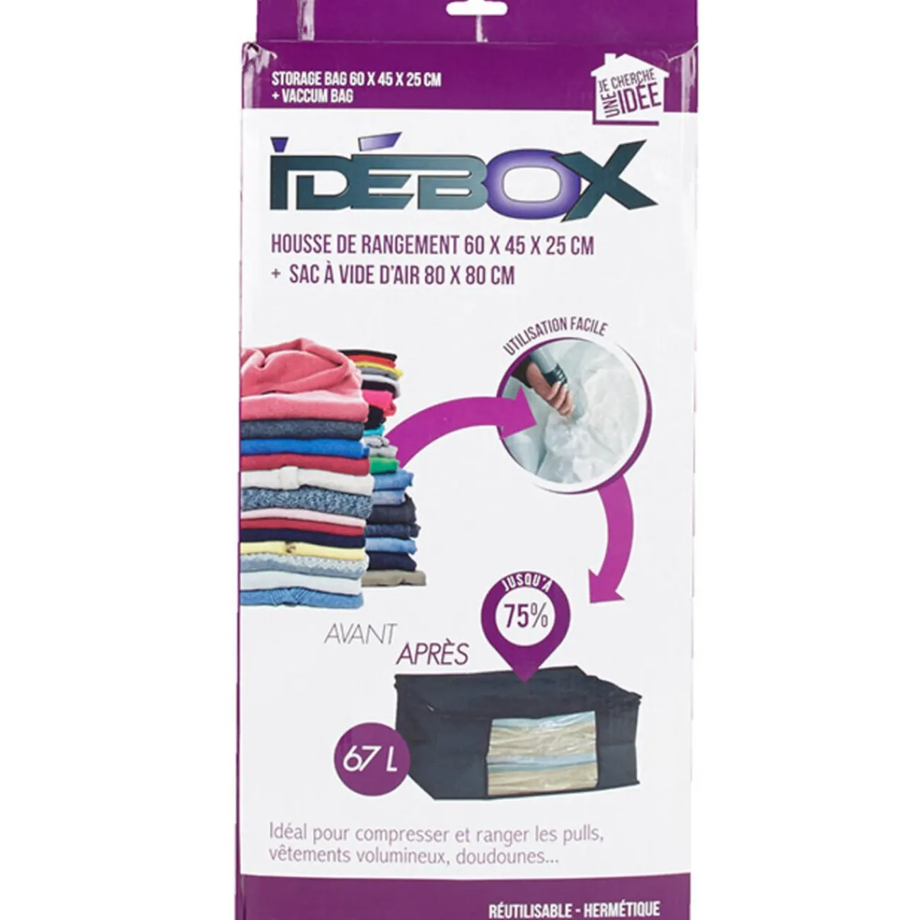 Housse de rangement 67 L, dim. 60x45x25 cm, 100 % polyester non tissé. Sac à vide air dim. 80×80 cm, 100 % polyéthylène. Réutilisable, hermétique et facile d’utilisation. Idéal pour compresser et ranger vos vêtements !
