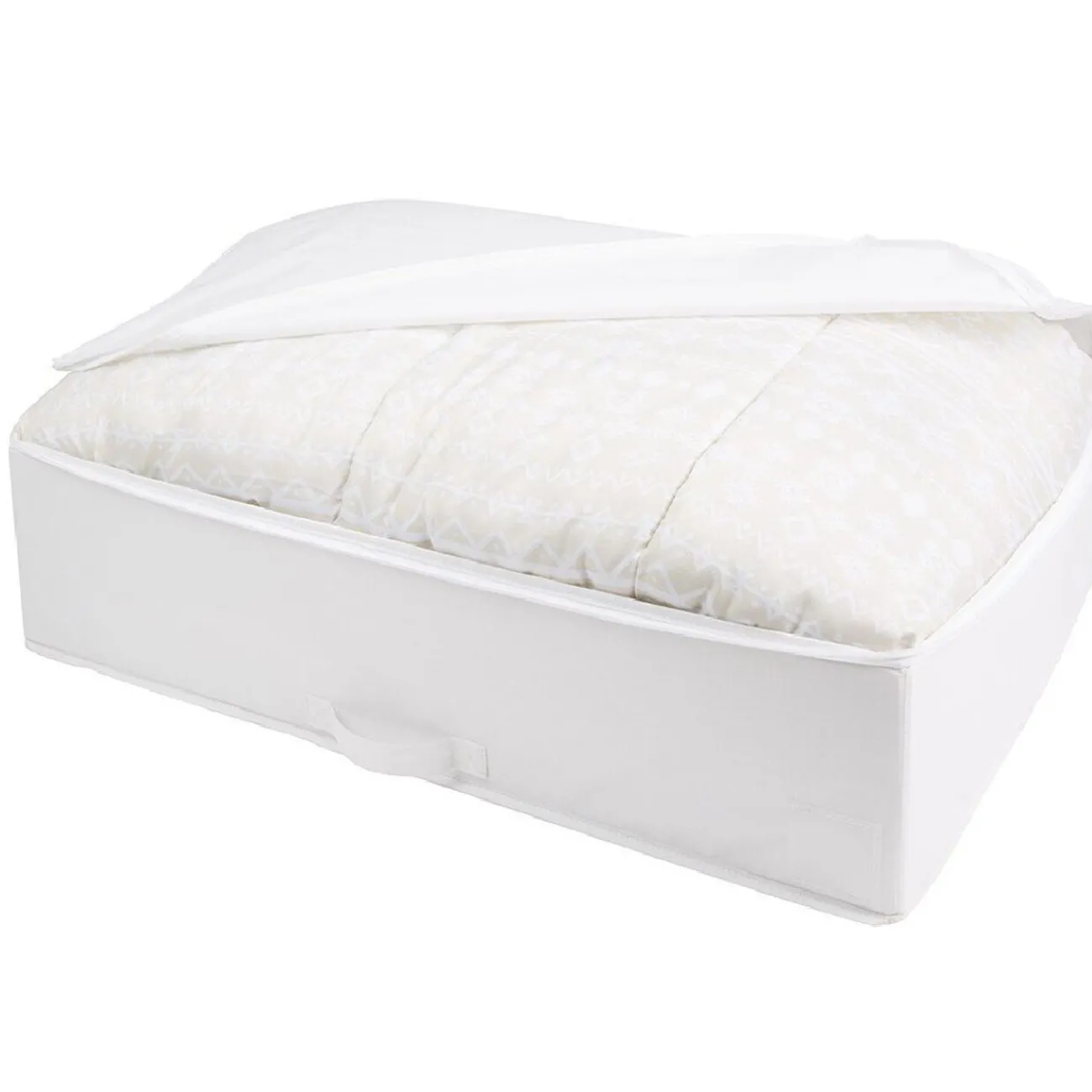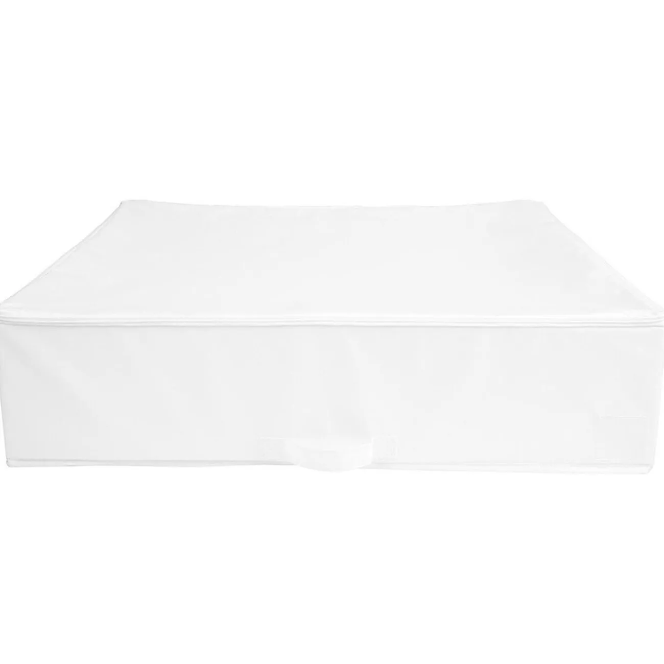 Housse de rangement rigide en tissu synthétique blanc, parfait pour y entreposer vos couettes et couvertures l’été !