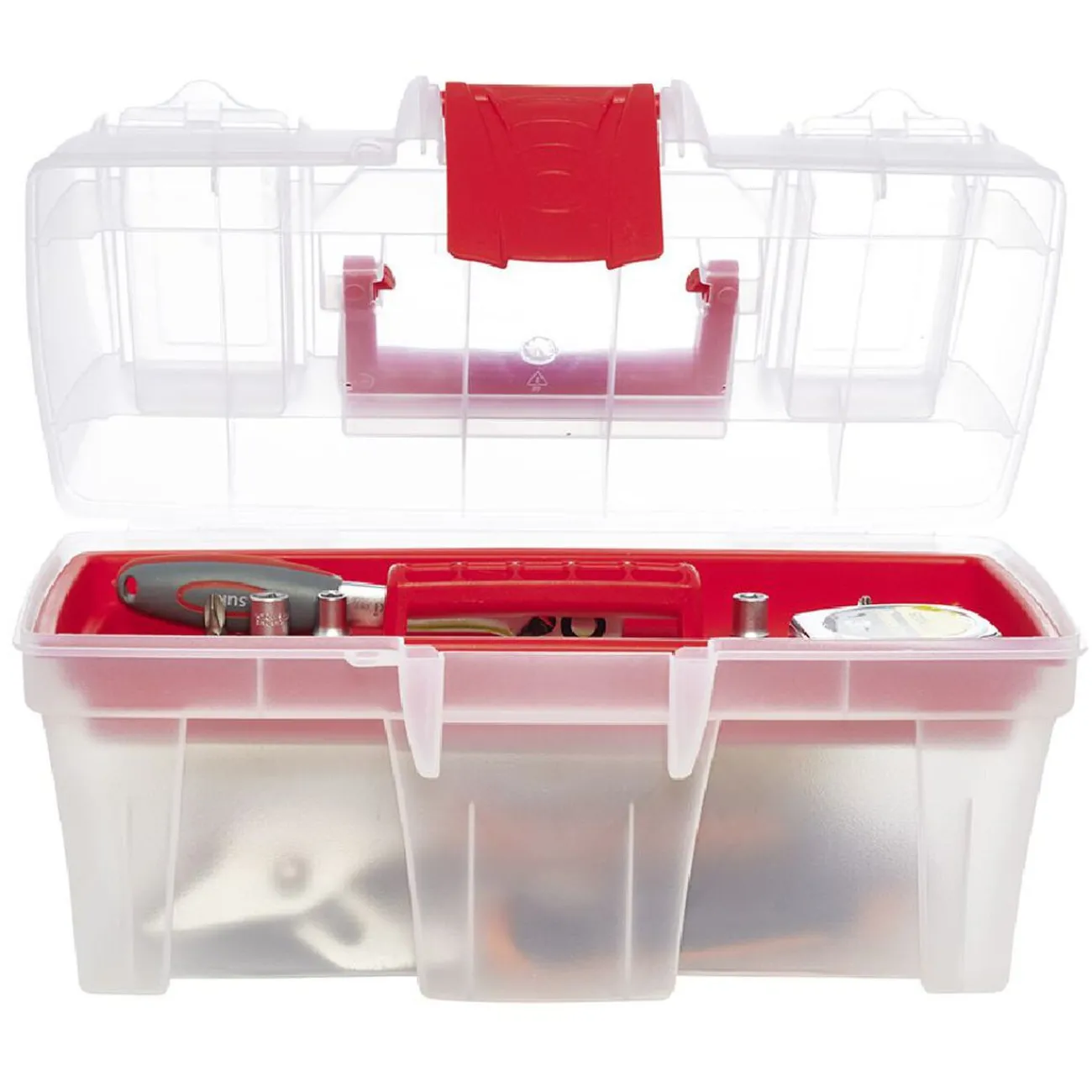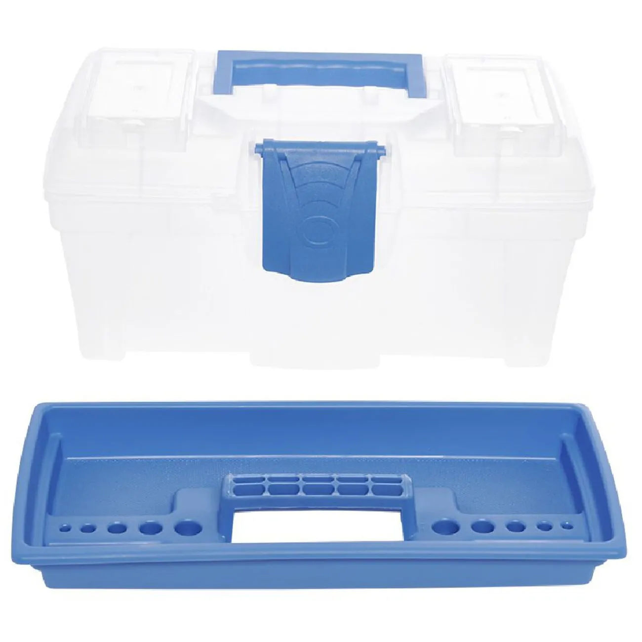 Mallette transparente à clips rouge ou bleu pour divers rangements.