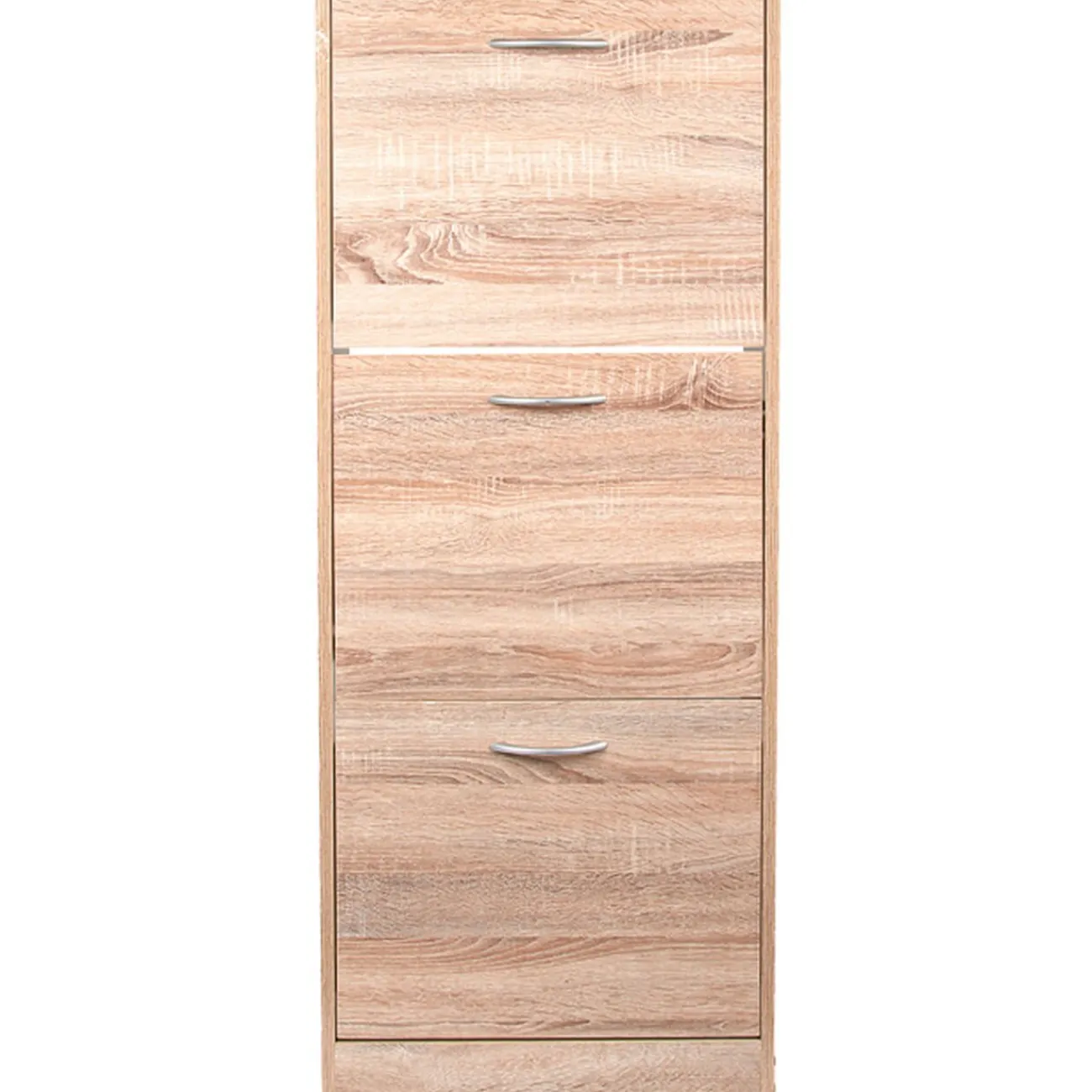 Grâce au meuble à chaussures Utah, rangez tous vos souliers ! Utilisez le design moderne de ce meuble afin de disposer tous vos baskets, vos ballerines ou encore vos sandales. Dans votre couloir ou votre chambre à coucher, il trouvera aisément sa place tout en embellissant votre pièce. Les 3 tiroirs répartis sur une colonne vous proposent de grands espaces de rangement que vous pouvez utiliser selon vos besoins et selon votre organisation. Peu encombrant, ce meuble vous permettra de glisser jusqu’à 12 paires de chaussures. En panneaux de particules, sa structure est revêtue de papier décor afin de lui apporter une protection supplémentaire. Sa couleur naturelle le rend idéal pour toutes sortes de décoration. Selon votre ameublement, vous pouvez utiliser ce meuble afin d’obtenir un design de pièce haut en couleur ou rustique. Si vous souhaitez harmoniser votre pièce, découvrez les autres meubles de la gamme Utah que vous pouvez associer avec celui-ci, tels que la table basse, l’étagère ou encore la commode.