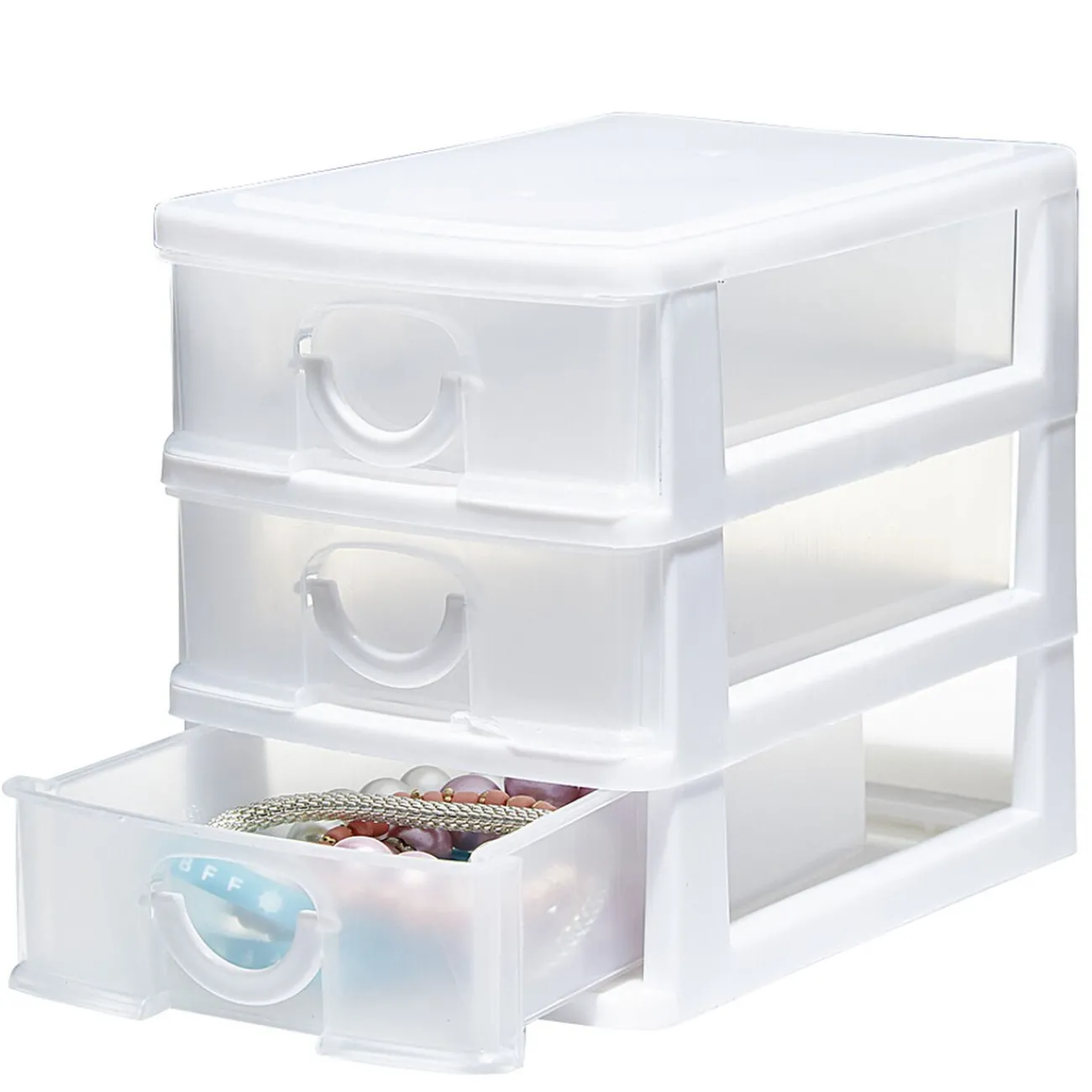 Petite boîte de rangement en plastique composée de 3 tiroirs transparents. Idéale pour l’organisation de vos petits accessoires de bureau, couture, atelier…