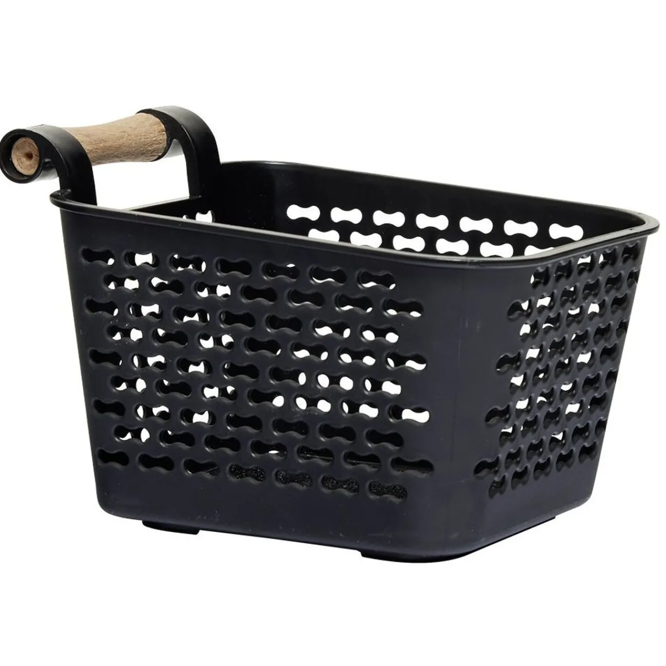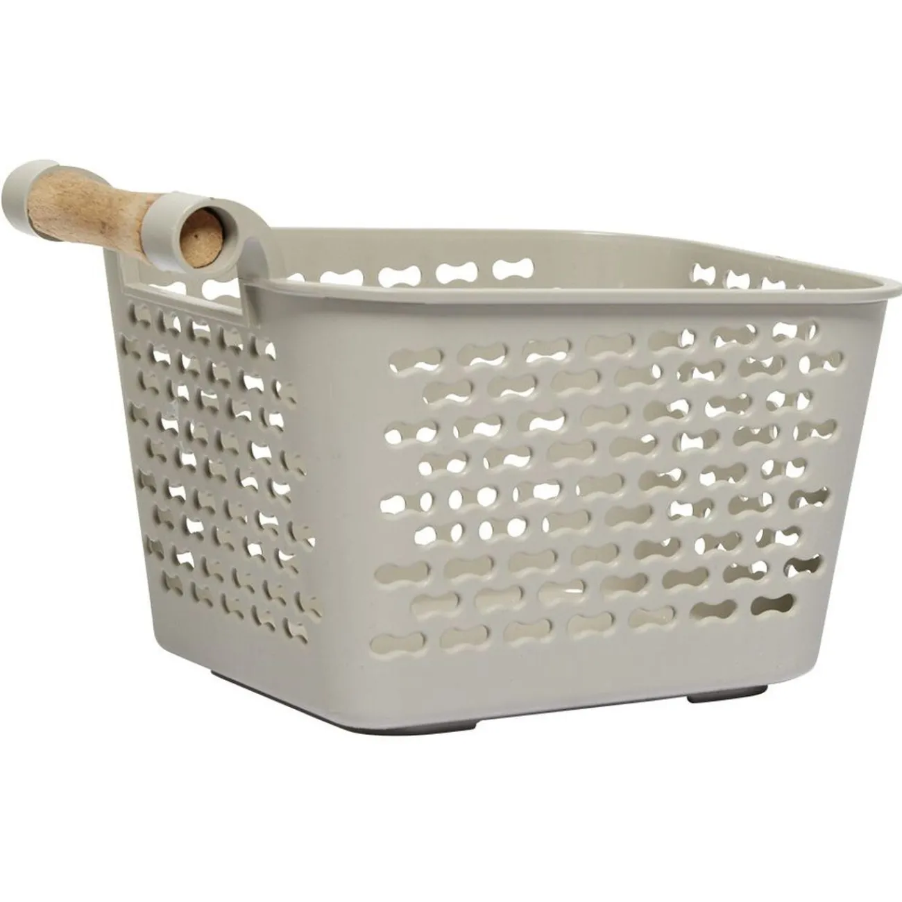 Mini panière en plastique avec une poignée en bois, idéale pour la trainer sans avoir à la porter.