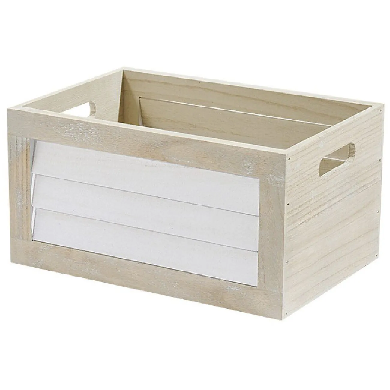 Panier déco pour salle de bain en forme de caisse de couleur naturel et blanc.