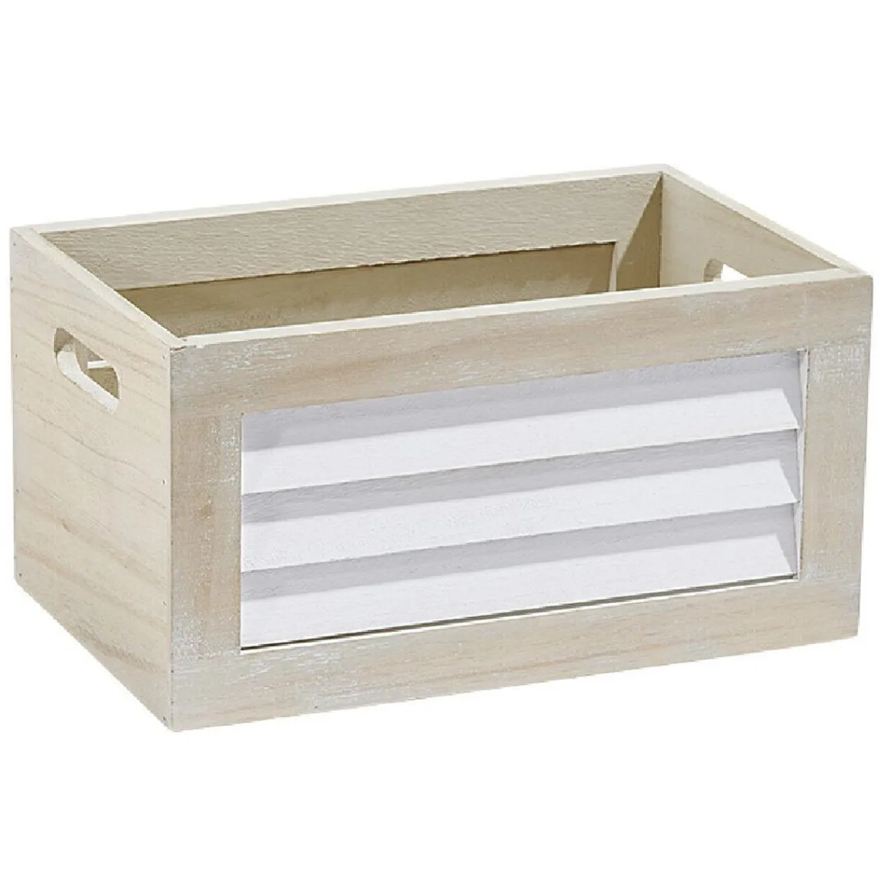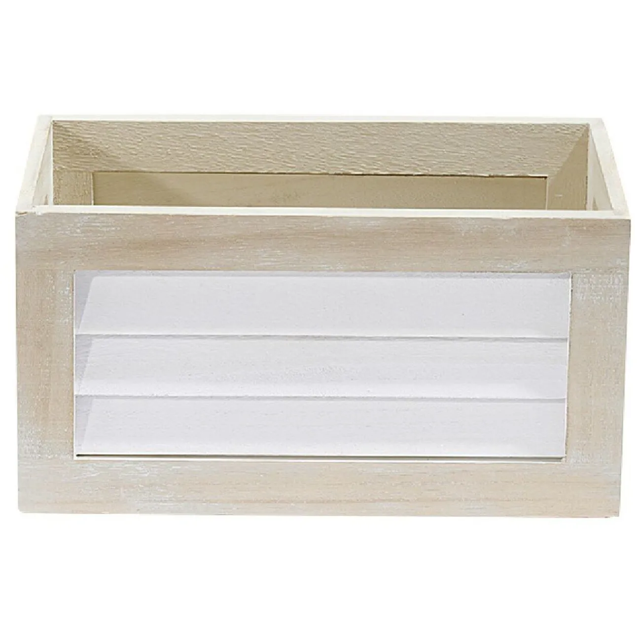 Panier déco pour salle de bain en forme de caisse de couleur naturel et blanc.