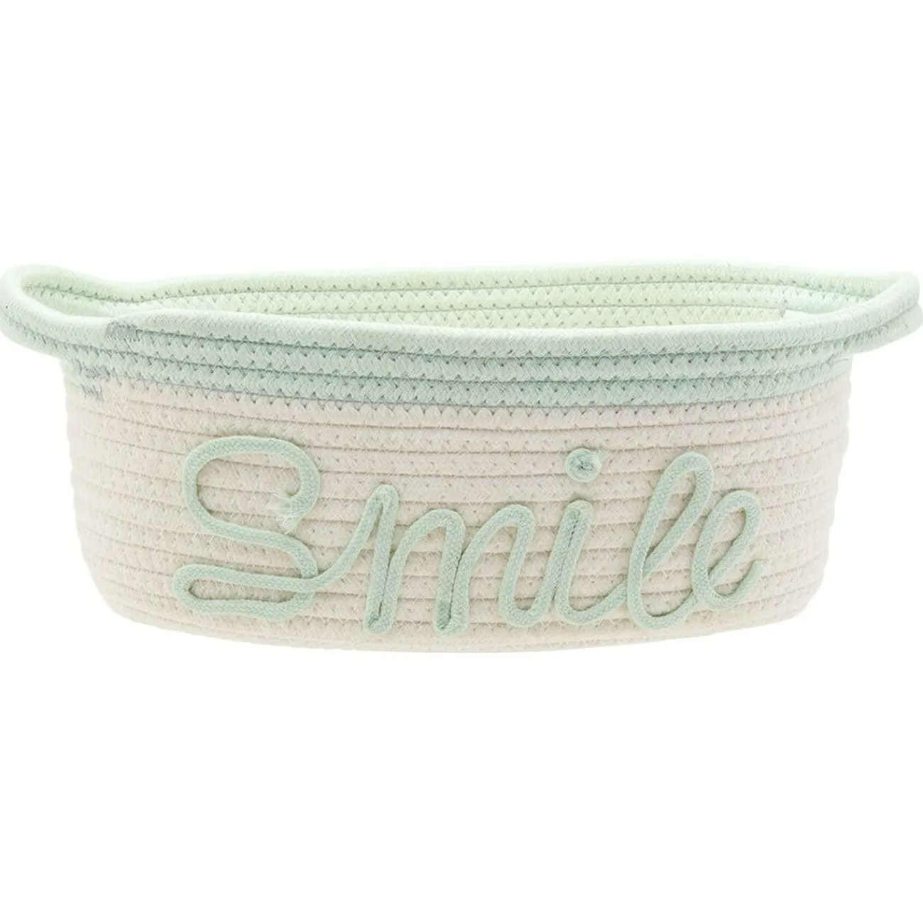 Petit panier en coton de 3 modèles différents : blanc et vert avec inscription « Smile », blanc et marron avec inscription « Love » ou blanc et noir avec inscription « Home ».