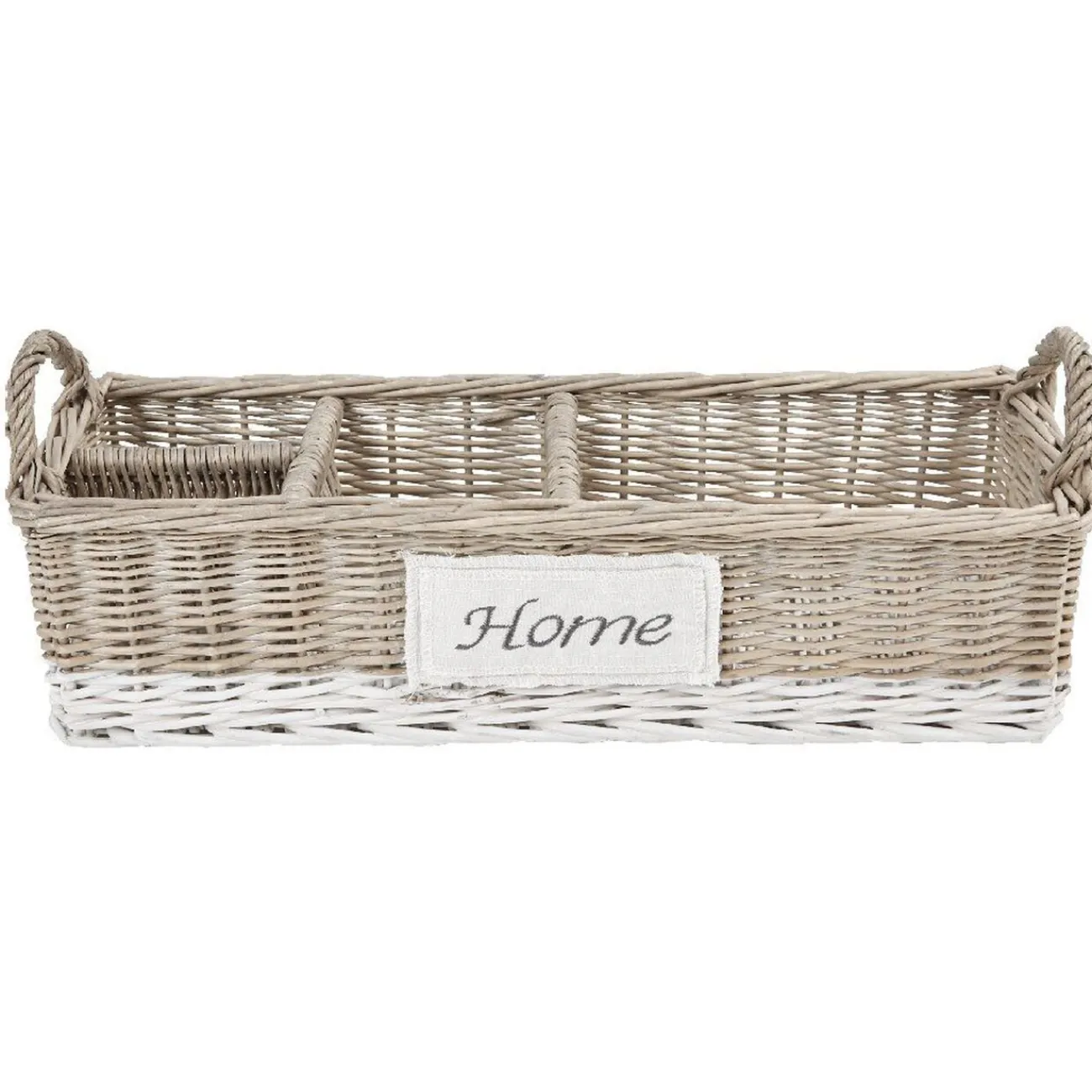 Panier de rangement avec compartiment en osier naturel et blanc design « home ».