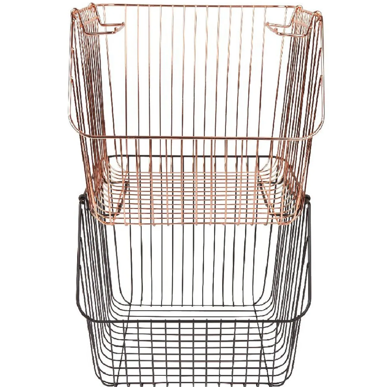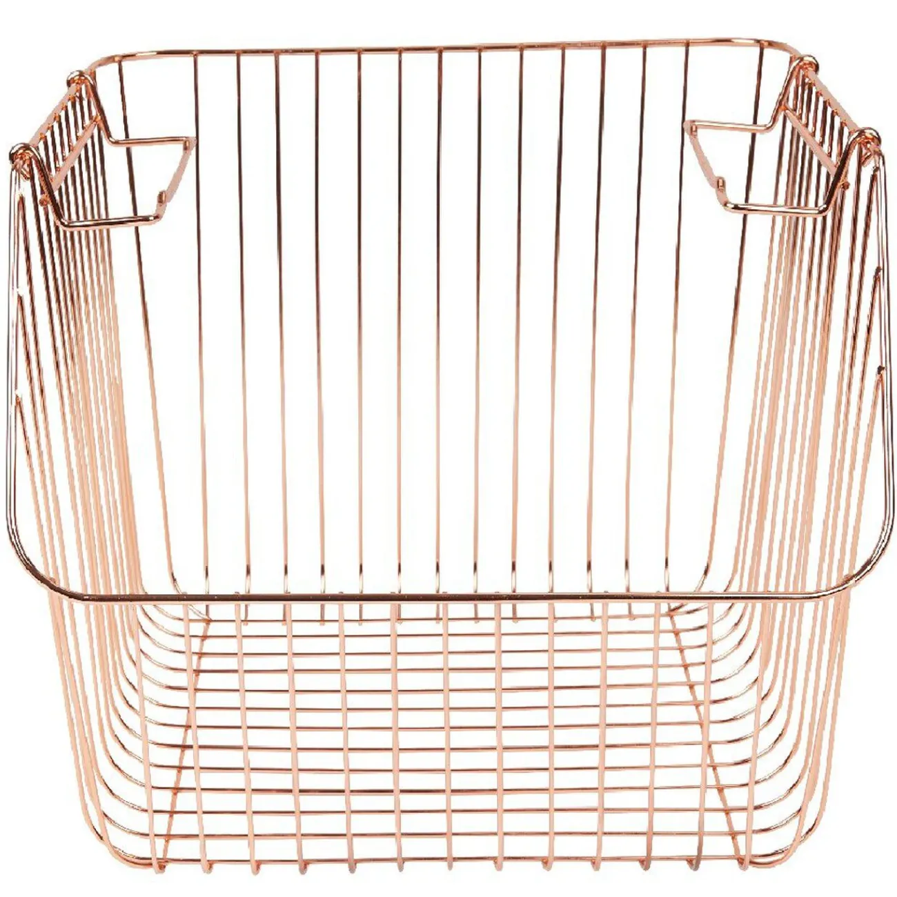 Optez pour ce panier au design filaire en métal de couleur cuivre, avec anses et superposable pour un accès direct au contenu.