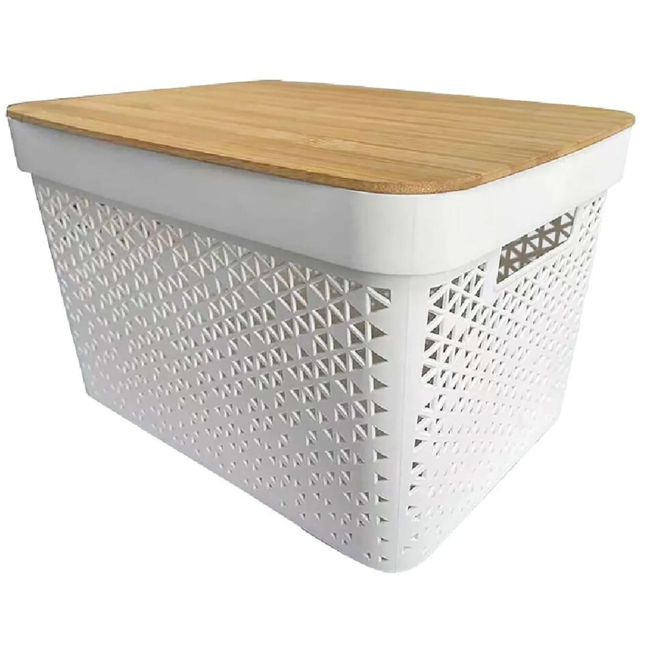 Jolie panière de rangement en plastique blanc ajouré avec couvercle en bambou.