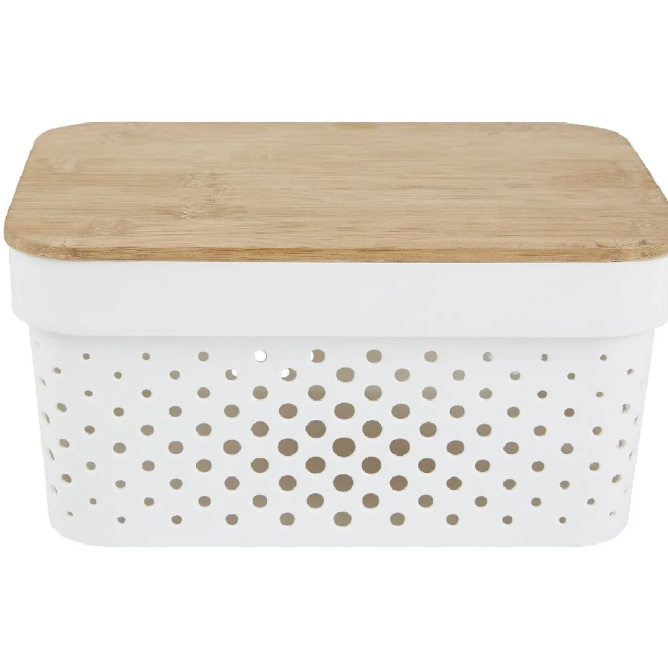 Jolie panière de rangement en plastique blanc ajouré avec couvercle en bambou. Superposable et ultra déco, cette jolie boîte de rangement trouvera sa place dans toutes les pièces de votre intérieur que ce soit dans la chambre, la cuisine ou la salle de bain…