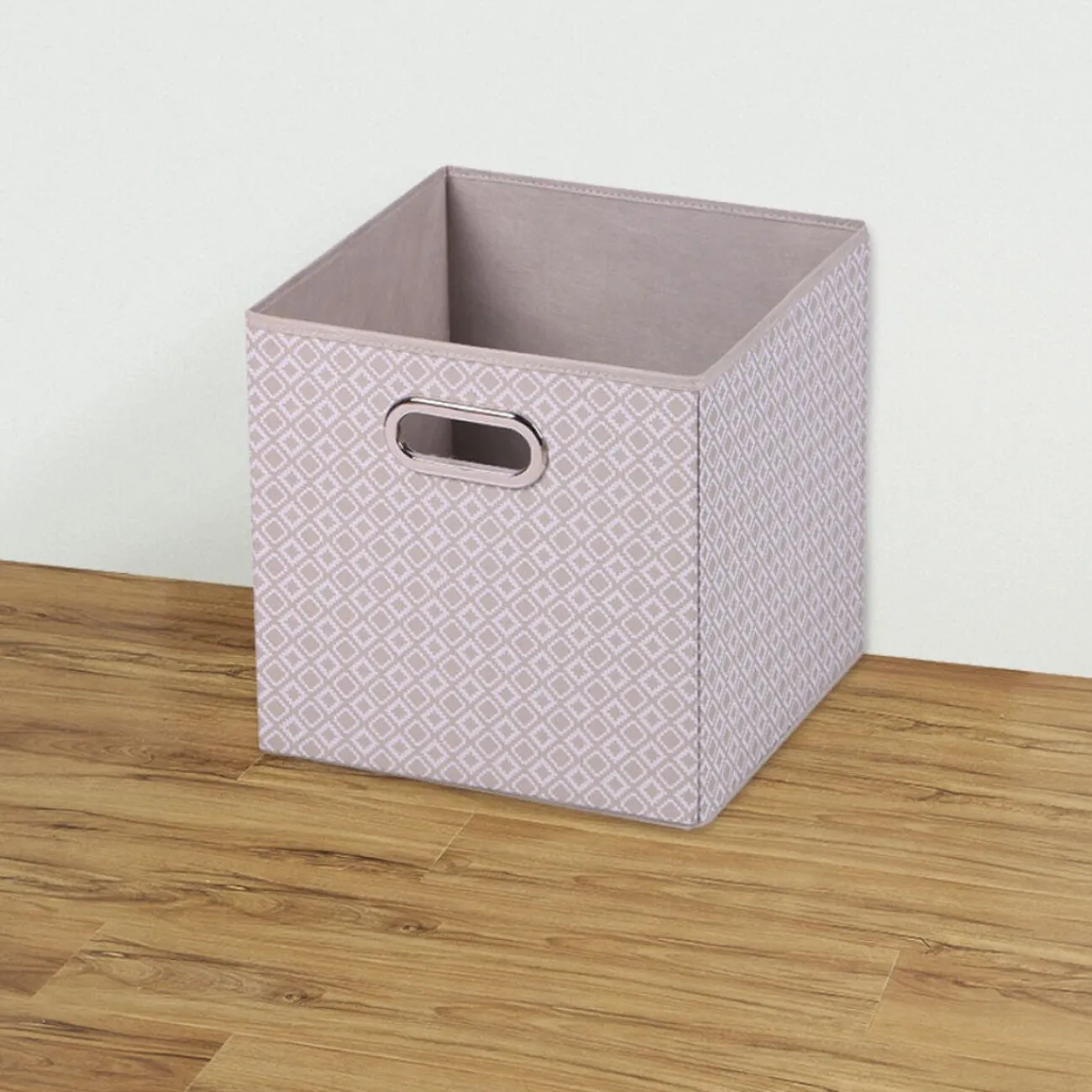 Panière de rangement carré avec motifs triangulaires beiges et blancs.