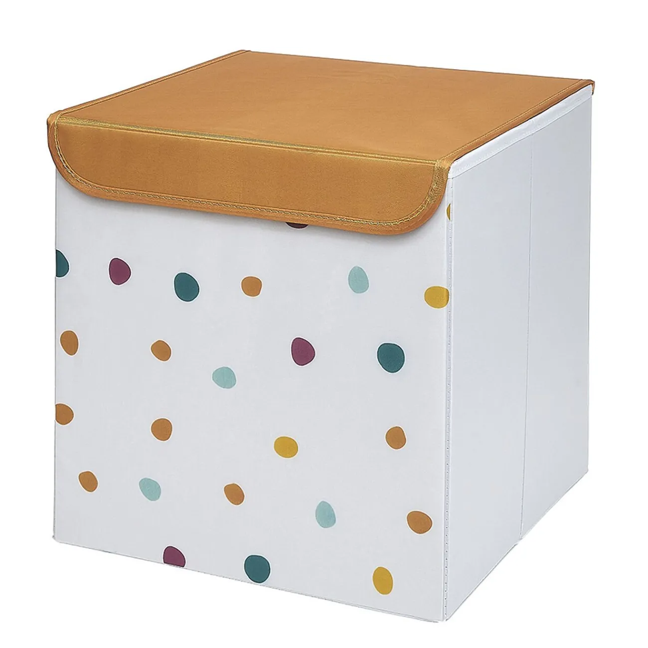 Jolie panière blanche à pois multicolore avec couvercle à rabat pour organiser et décorer la chambre de vos enfants. Pratique pour ranger le petit linge, les jeux et innombrables trésors qui traînent partout !