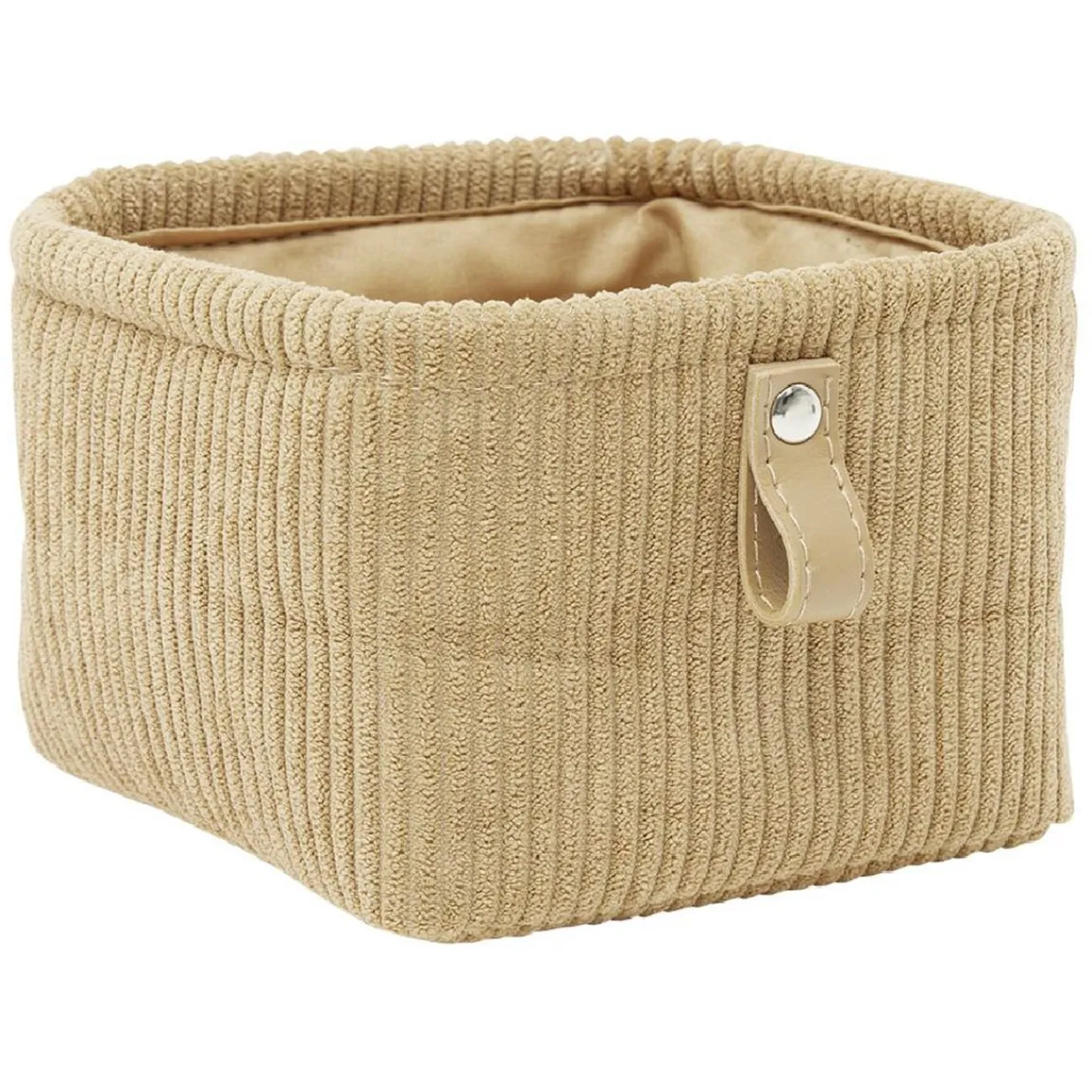 Cette petite panière en velours côtelé beige apportera douceur et style à votre rangement. Idéal pour organiser vos petites affaires sur les étagères.
