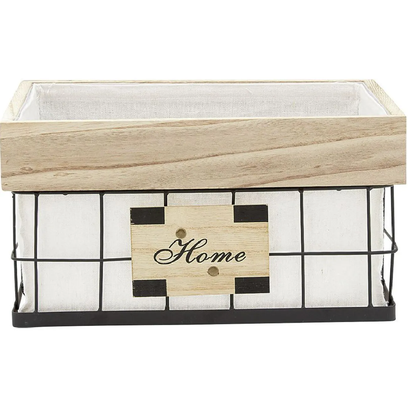 Panière déco carrée avec inscription « Home » de couleur naturel avec quadrillage noir et tissu blanc.