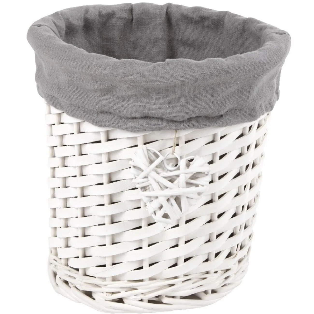 Panière en osier blanche et tissu gris. Ø18 x H19 cm.