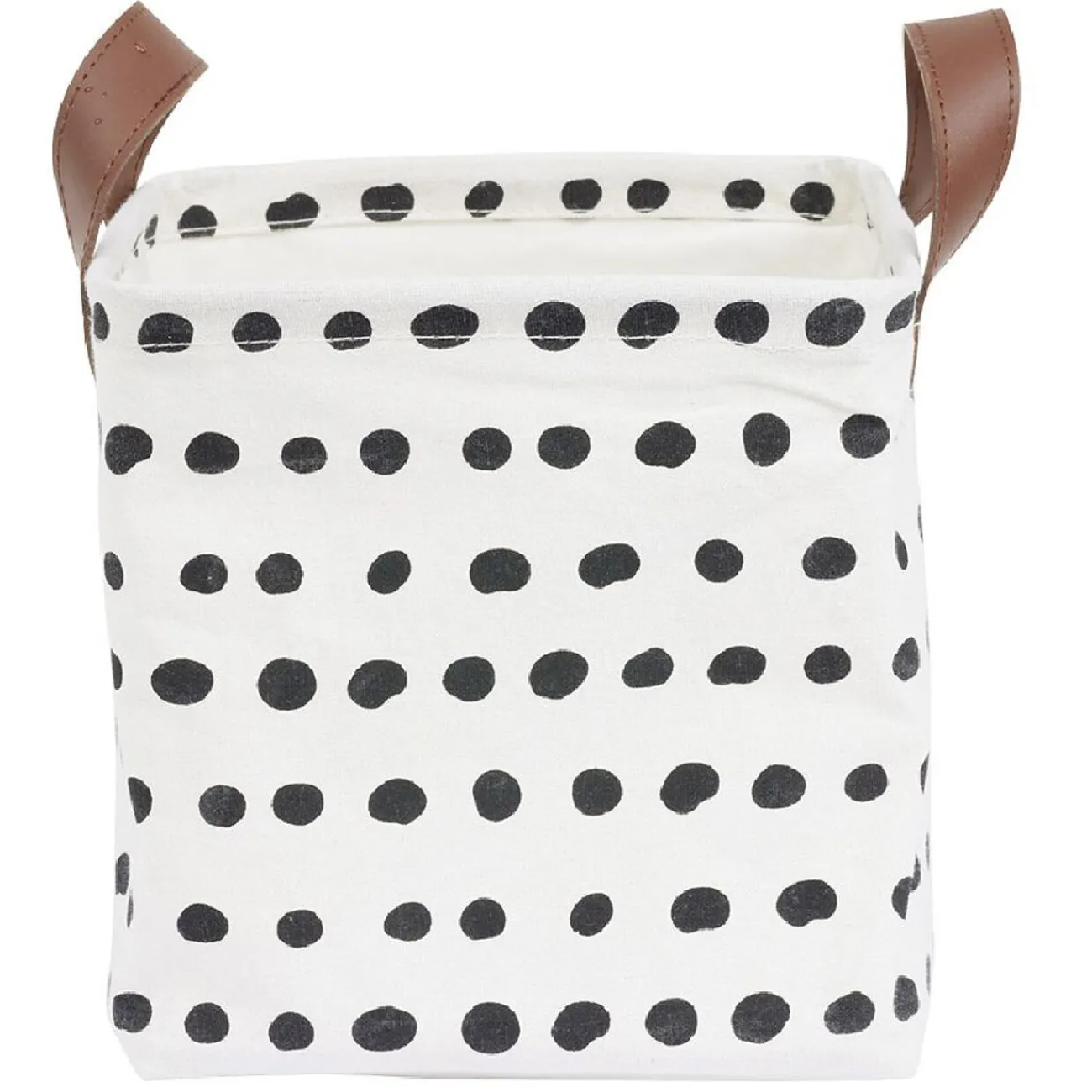 Cette panière carrée en tissu blanc à motifs pois noirs, munie de deux anses en simili marron, est idéale pour ranger vos petits objets du quotidien.