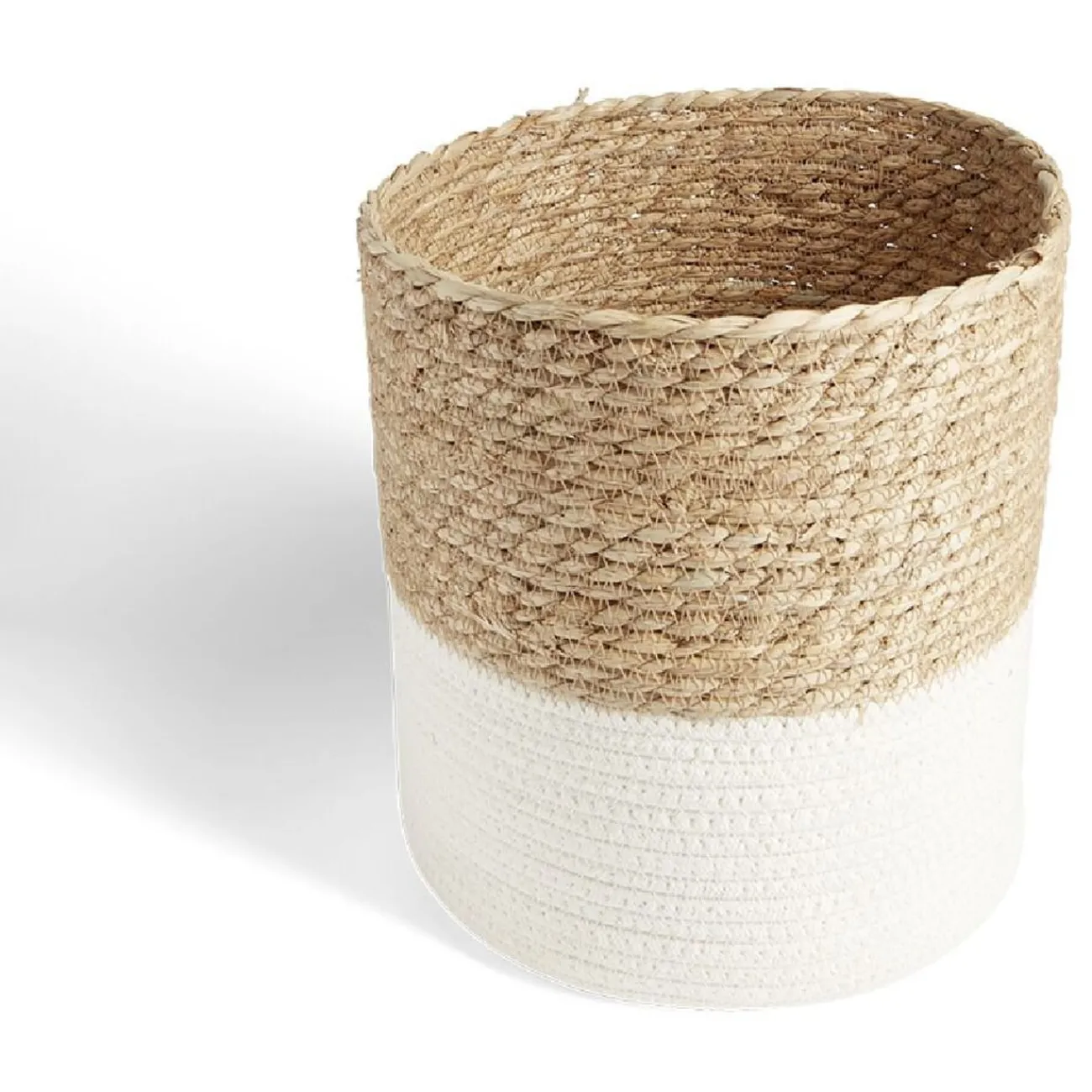 Mixant coton et jacynthe, cette panière tressée en blanc et naturel offre une touche élégante et raffinée.